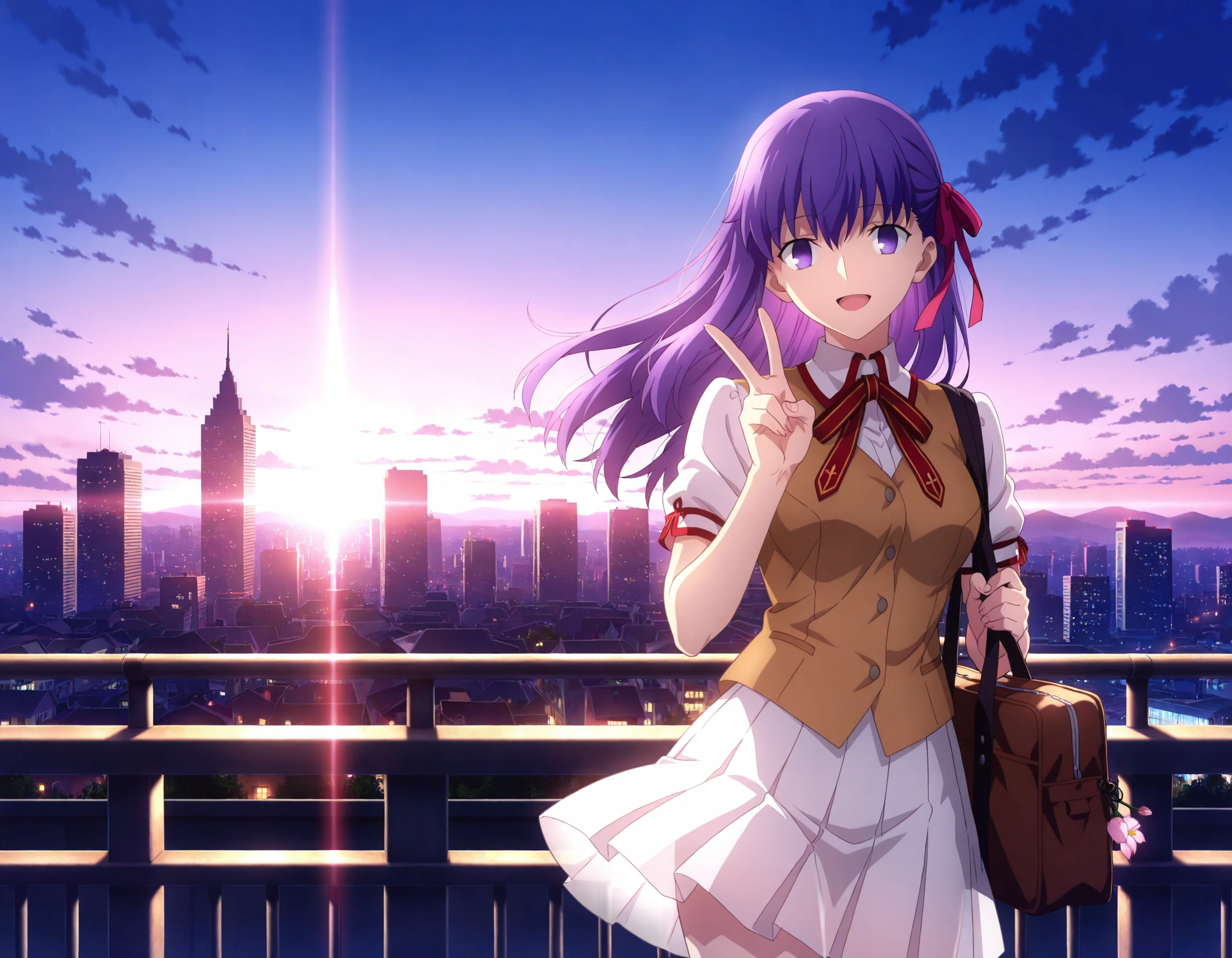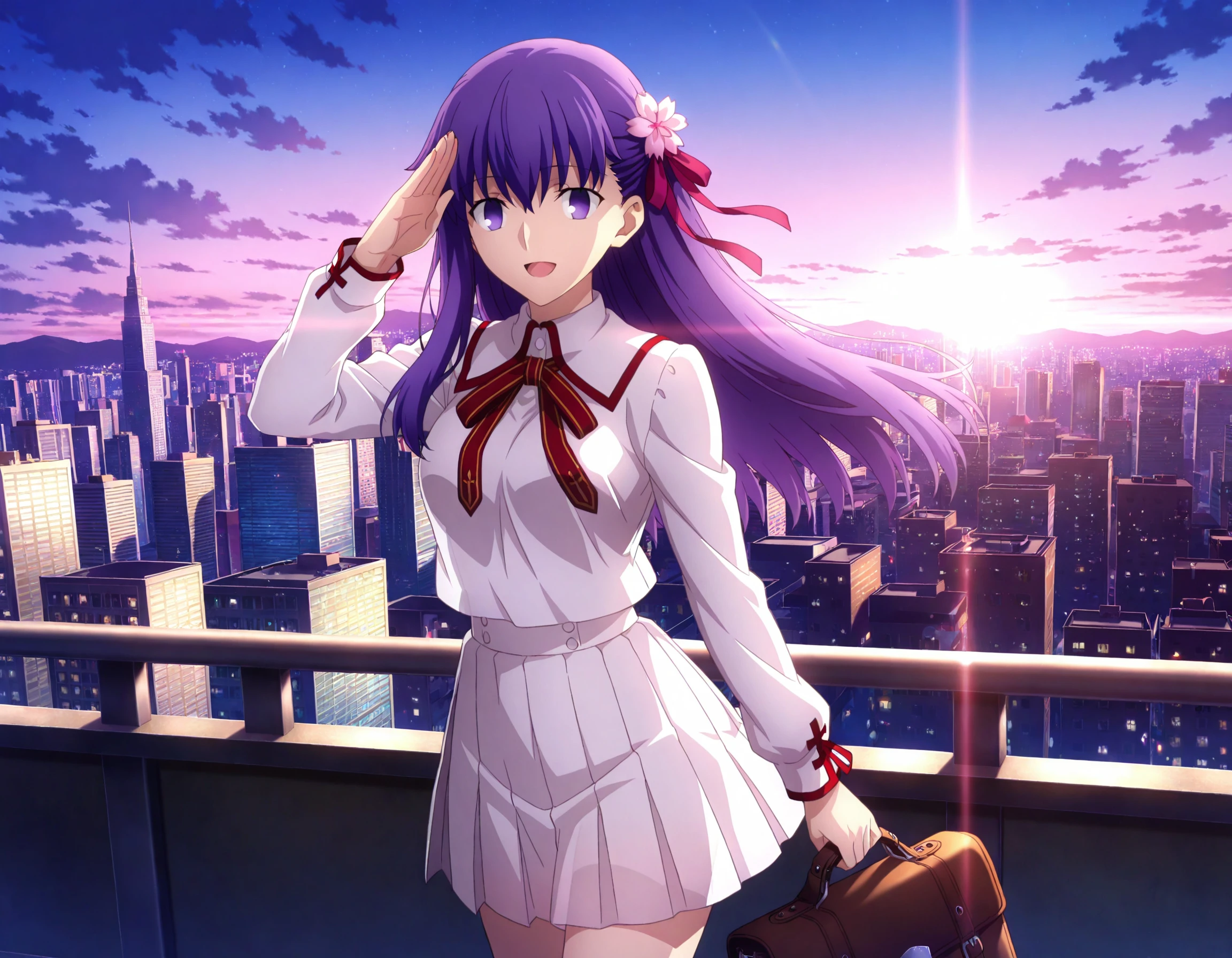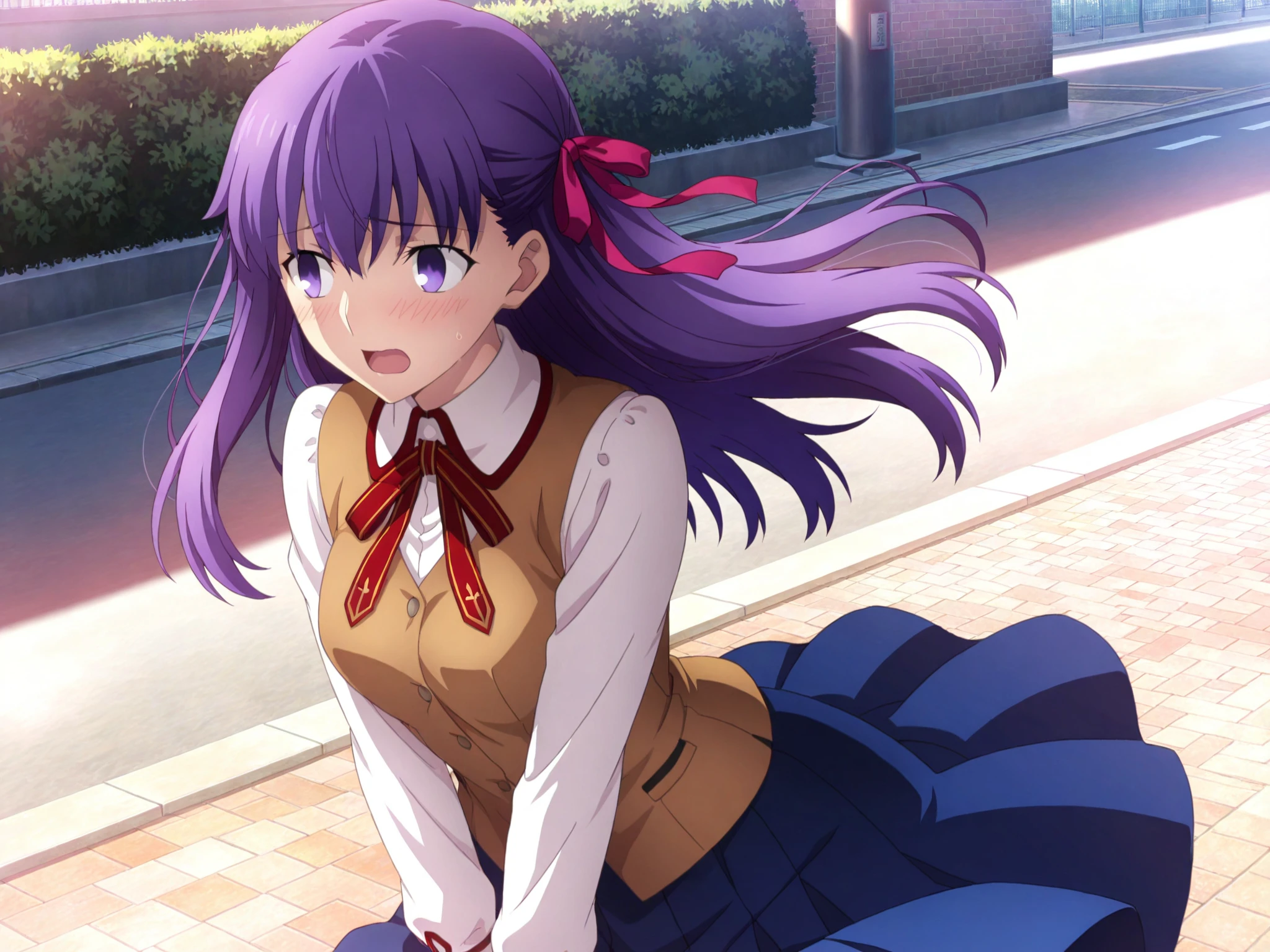 more details,incredibly absurdres,wallpaper,fate_stay_night,matou_sakura,<lora:sakura:0.8>,1girl,hair ornament,purple hair,purple eyes,red ribbon,long hair,hair ribbon,open_mouth,school_uniform,available light,very long hair,drunk,full body lens,wine bottle,