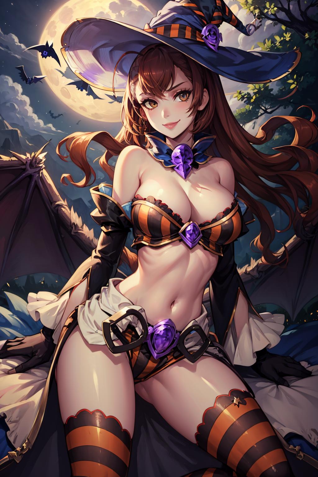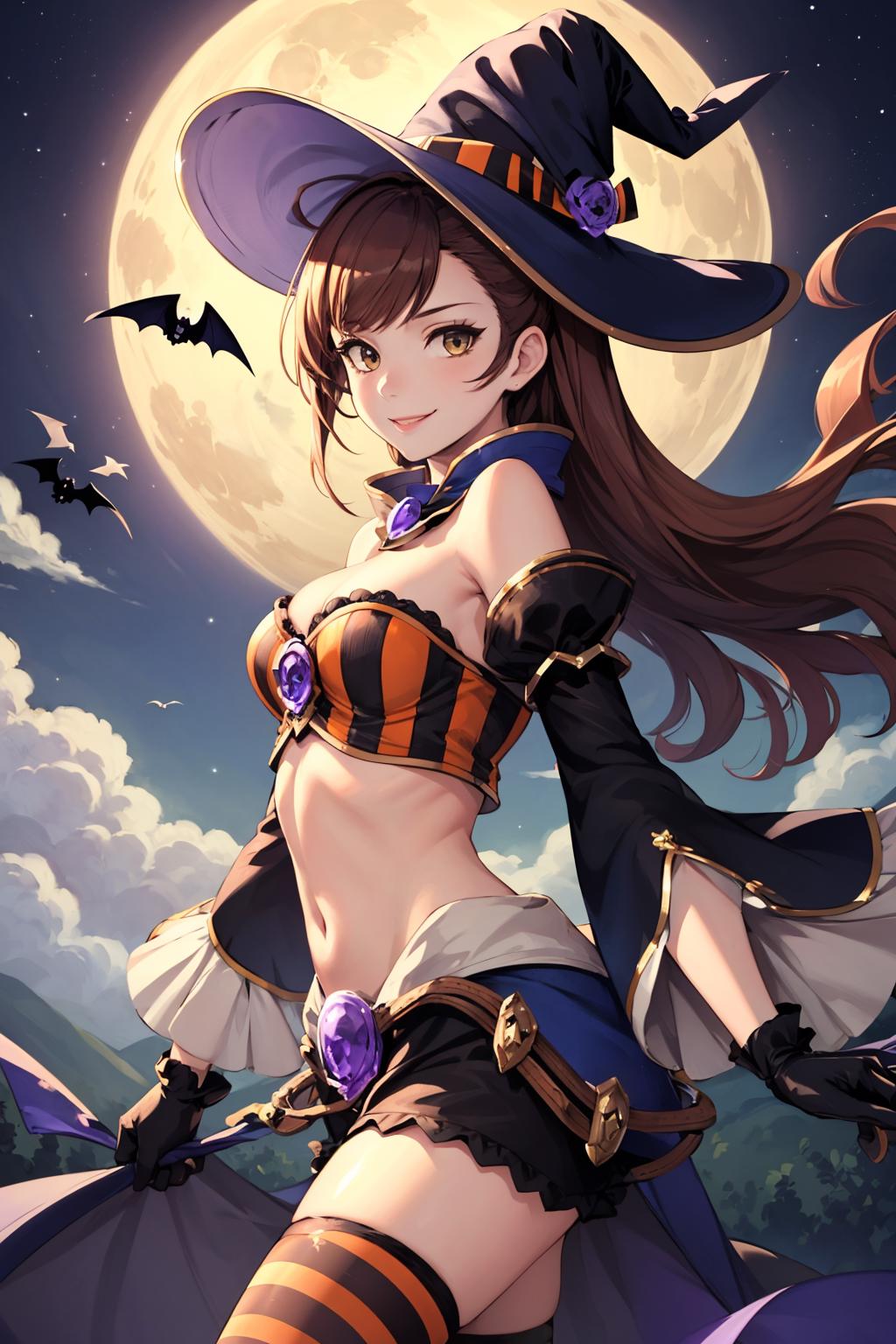 • Add "halbeatrix, detached collar, halloween, witch hat, midriff, detached sleeves, black gloves, striped thighhighs, high heels" for her Halloween outfit.