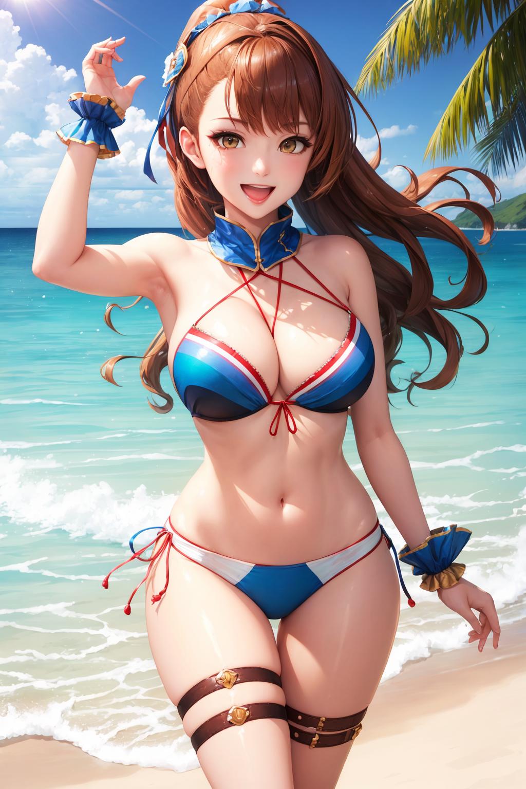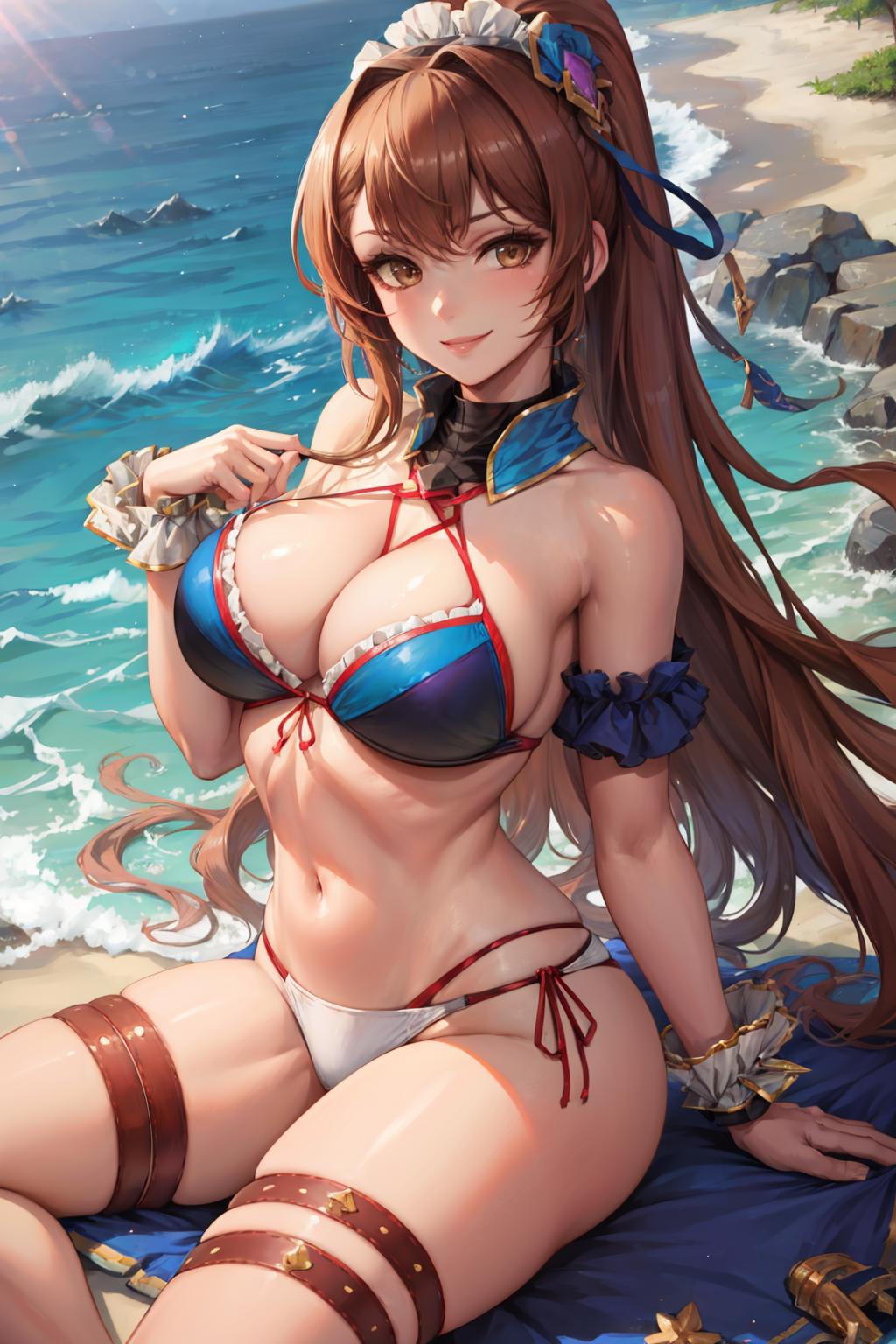 • Add "sumbeatrix, ponytail, blue bikini, side-tie bikini bottom, hair ornament, wrist cuffs, thigh strap" for her Summer outfit.