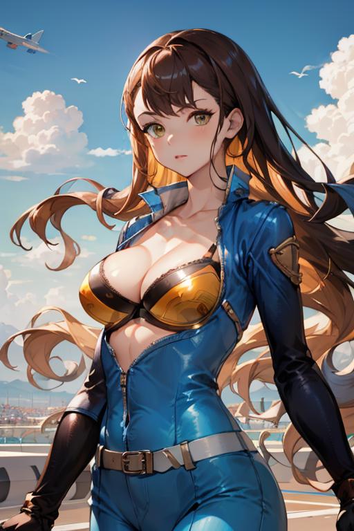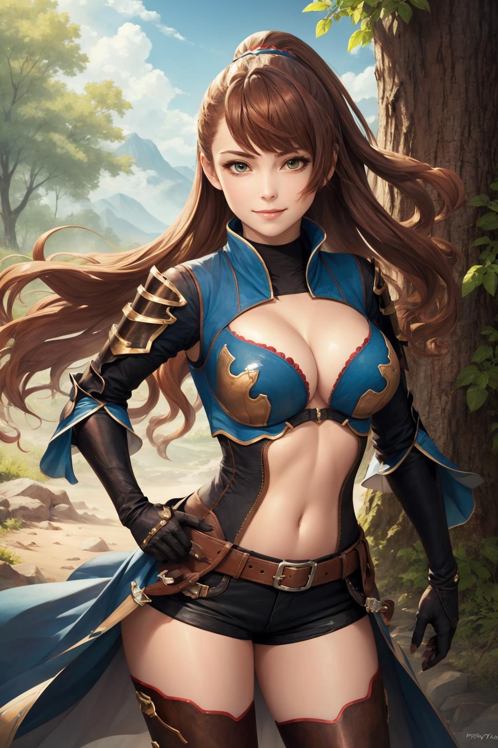 • Add "defbeatrix, ponytail, hair ribbon, armor, blue shirt, gauntlets, cleavage cutout, belt, short shorts, thigh boots" for her regular appearance.