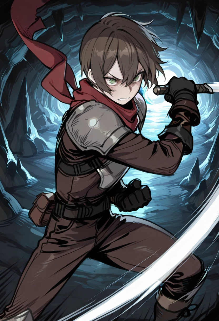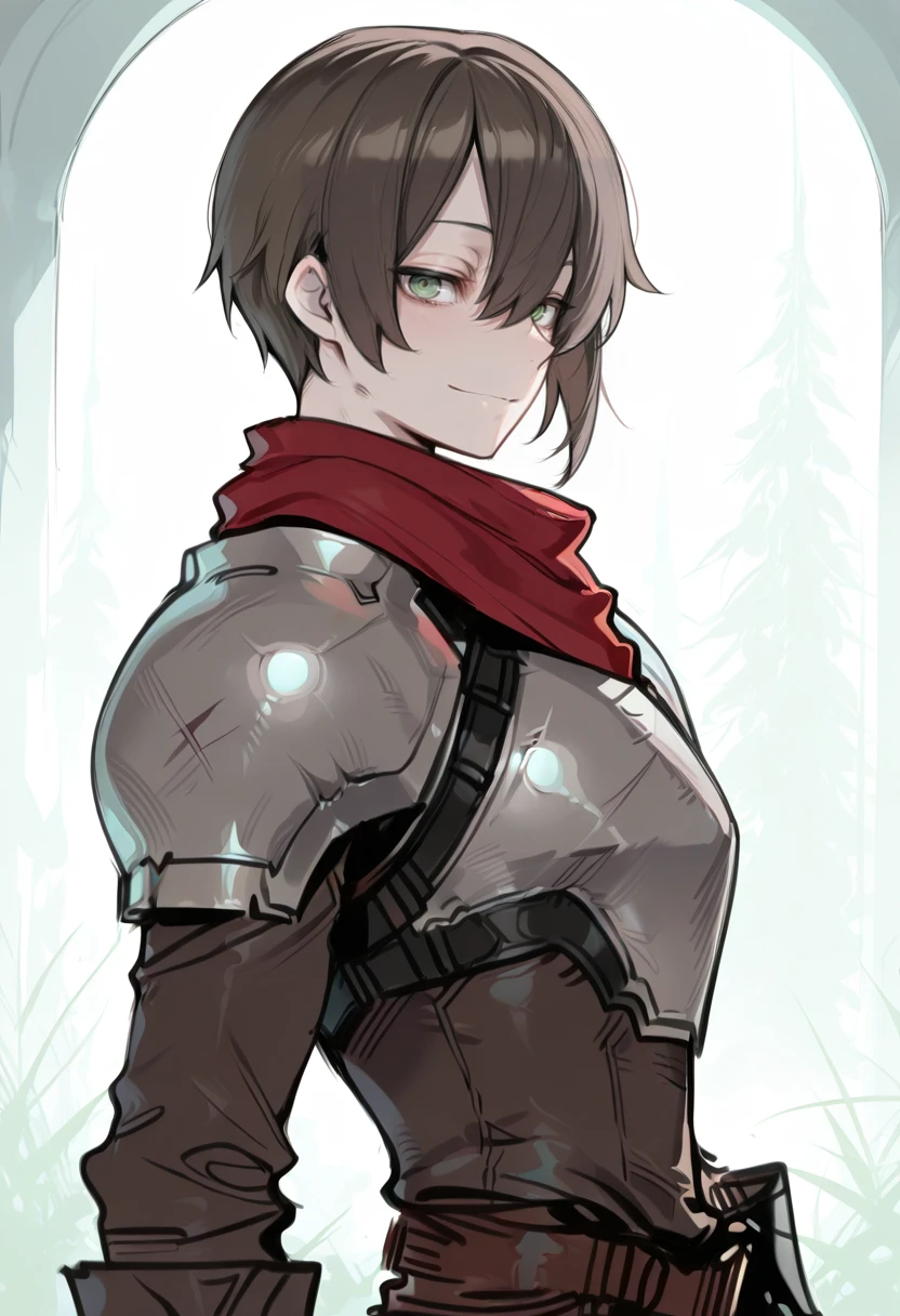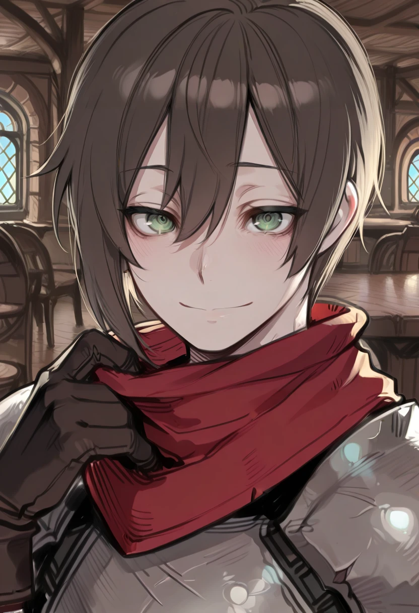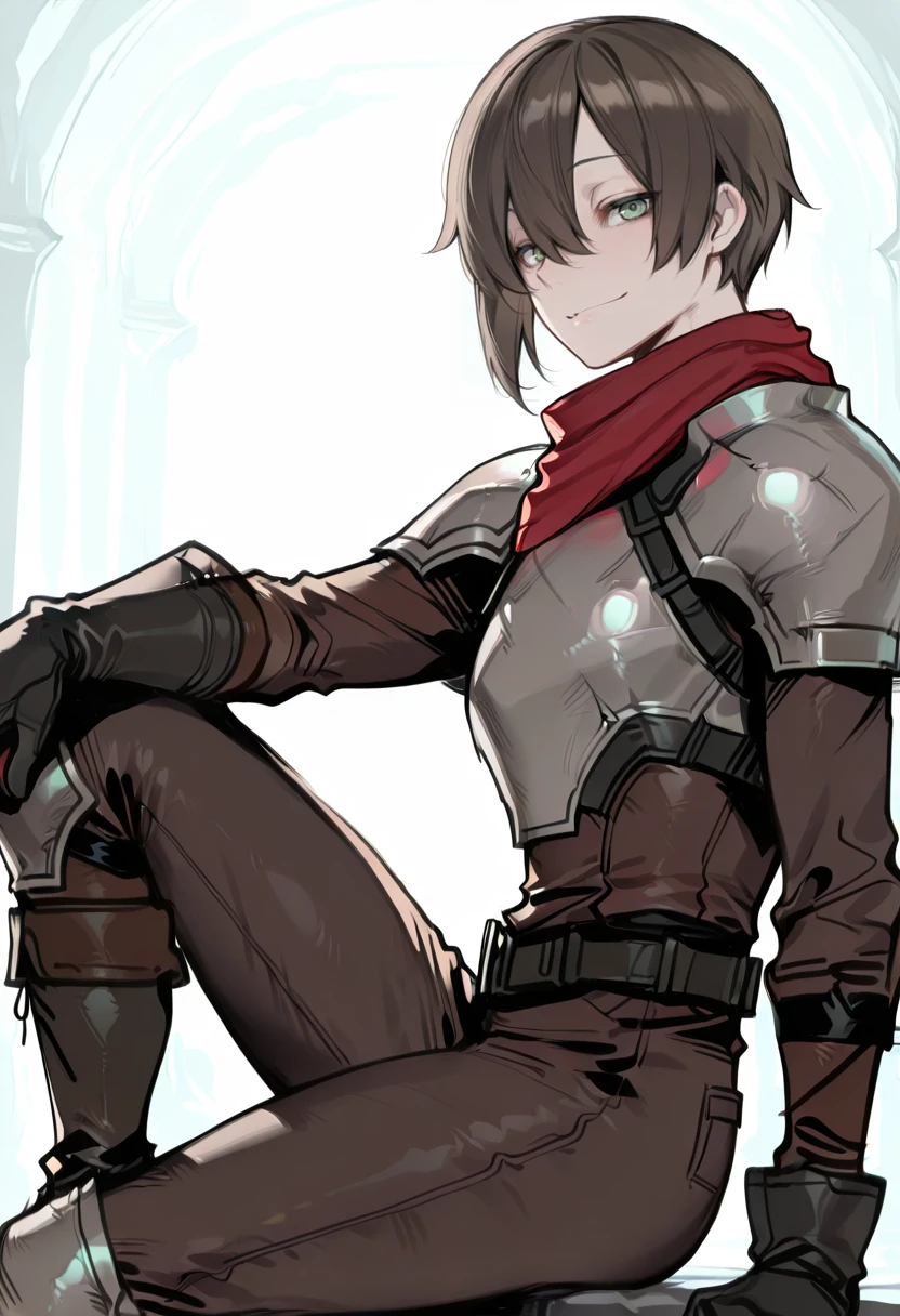 armor, red scarf, gloves,