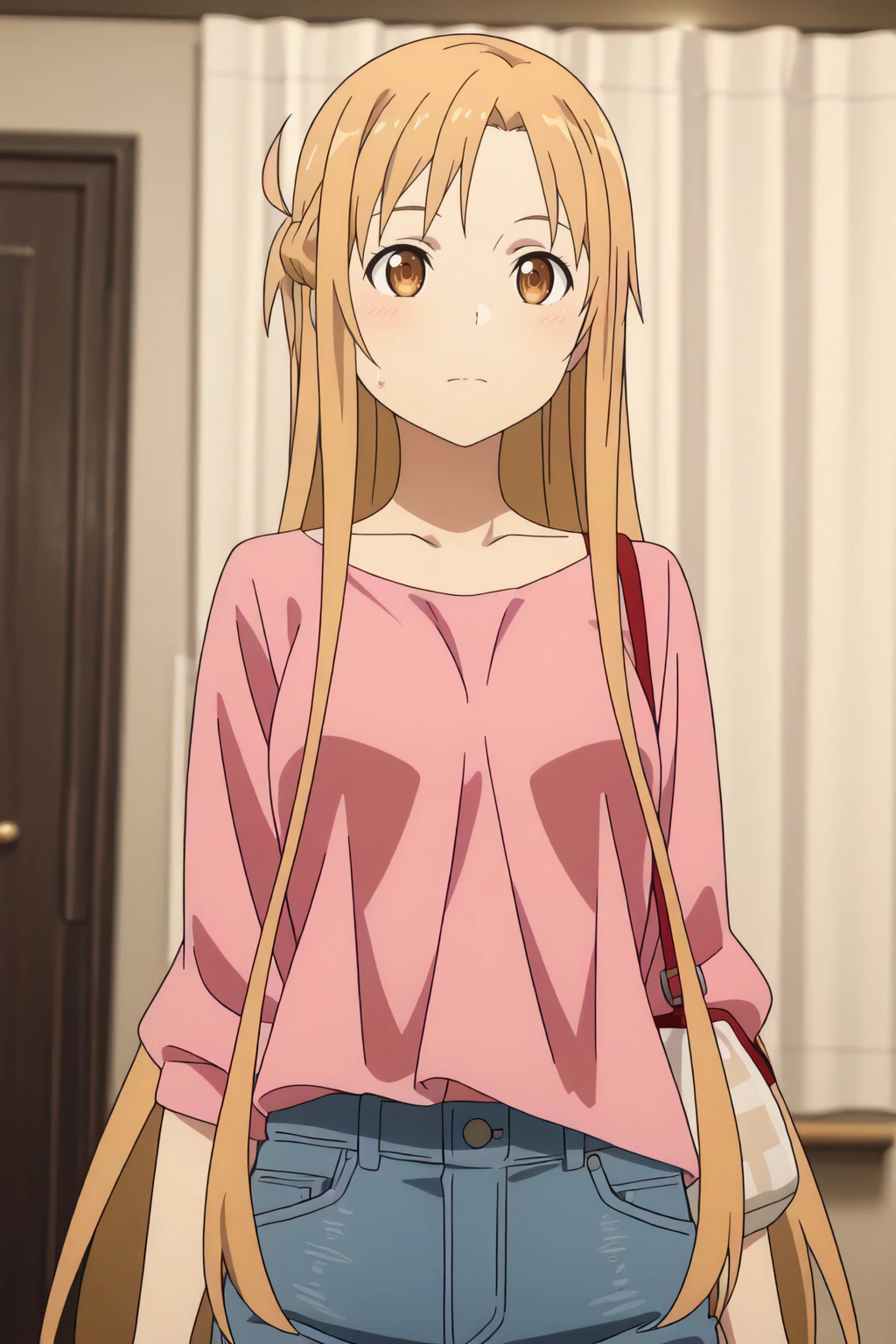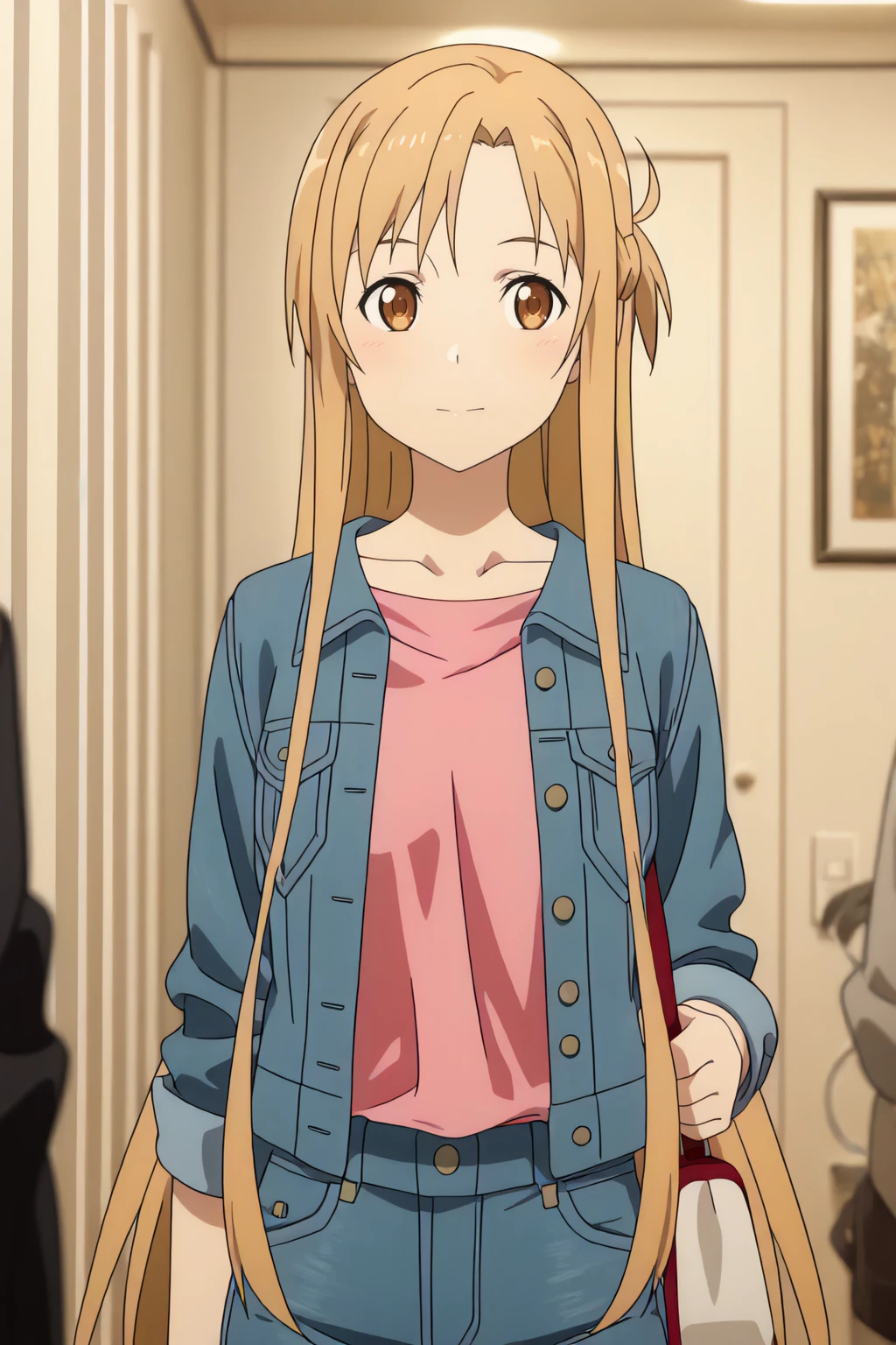 blue-jeans pink-shirt, jeans jacket, handbag,