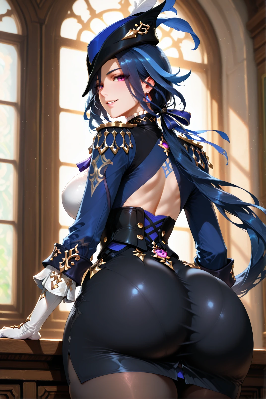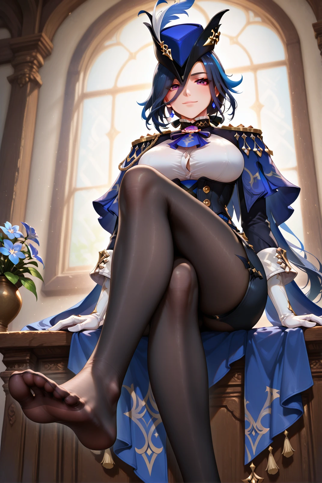 ilclorinde, 1girl, breasts, 1boy, ???, pantyhose, hat, ???????, hetero, vision \(genshin impact\), clothed female ???? male, ????, ???, large breasts, long hair, open mouth, clorinde \(genshin impact\), x-ray, blue hair, torn clothes, ??? in ?????, blue headwear, dark-skinned male, blush, tricorne, ascot, gloves, ahegao, internal ???????, uterus, tongue, ?????, blue ascot, purple eyes, long sleeves, tongue out, vaginal, black corset, breasts out, black pantyhose, ???????????, white shirt, faceless, dark blue hair, dark skin, hat feather, torn pantyhose, epaulettes, faceless male, standing, shirt, ??? from behind, corset, clothed ???, from side, low ponytail, blue cape, rolling eyes, white gloves, cape<lora:illustrious Clorinde 768x1152:1>room