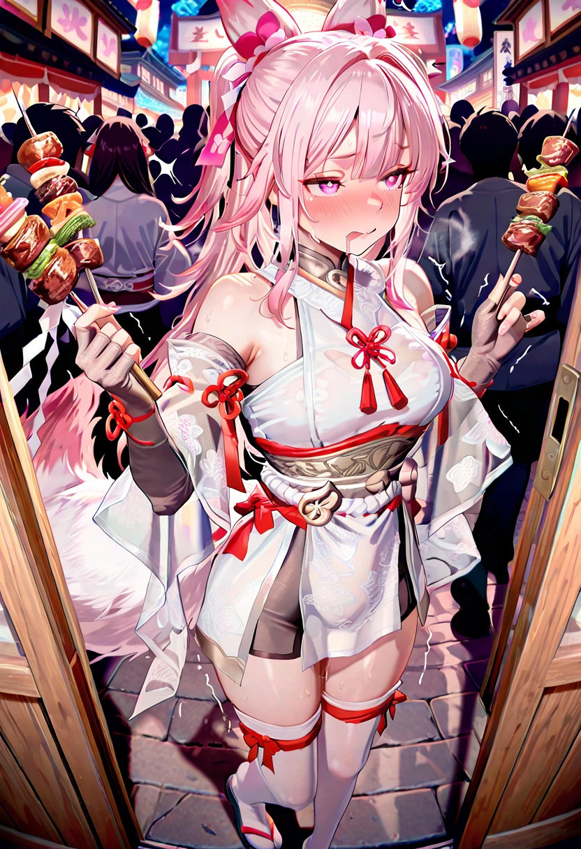 white kimono,fingerless gloves,ribbon,see-through,sash,short kimono,white thighhighs,wide sleeves,zouri,bare shoulders,