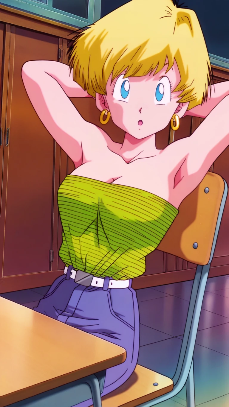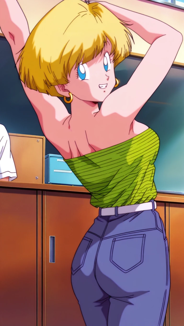 school outfit, green tube top, stripes, shirt tucked in, bare shoulders, breasts, cleavage, jewelry, earrings, belt, denim, jeans,