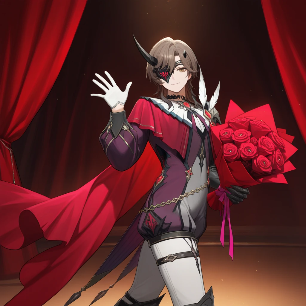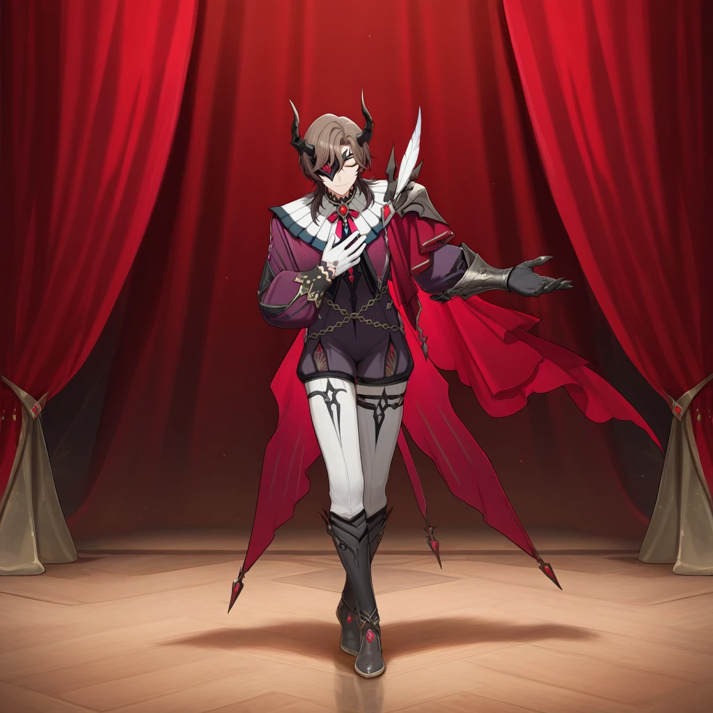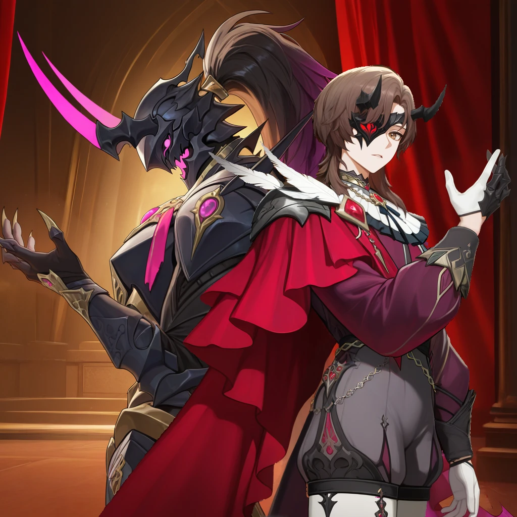 PhantasioDNA, Phs_Def, 1boy, male focus, brown hair, brown eyes, one eye covered, black mask, half mask, black horns, horns, side cape, maroon cape, frilled cape, pendant, magenta ribbon, neck ribbon, black choker, brooch, white feather, single pauldron, white gorget, gorget, red gemstone, unitard, puffy shorts, grey unitard, purple sleeves, black trim, chain belt, crossed belts, puffy long sleeves, black sleeve cuffs, white gloves, asymmetrical gloves, black gauntlets, single gauntlet, white pants, pants under shorts, leg strap,Subject 47 Outfit: