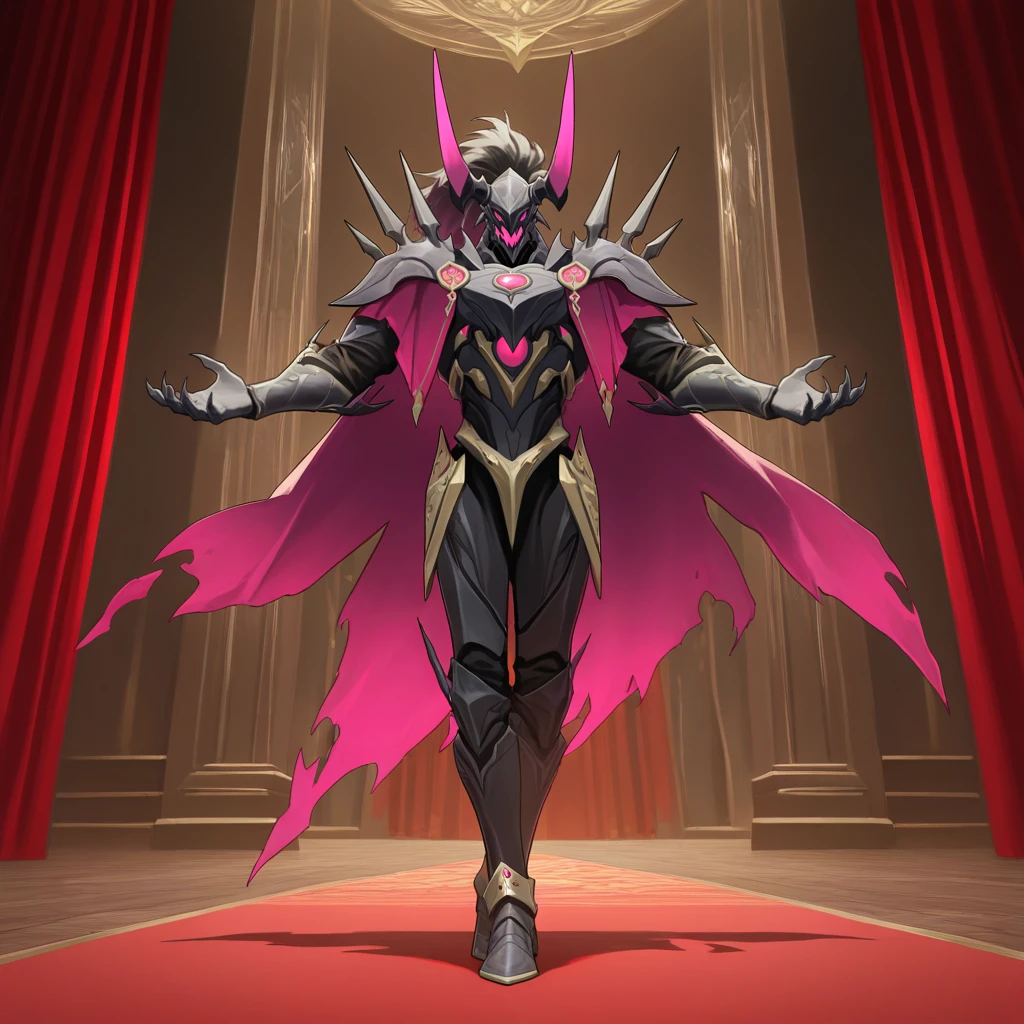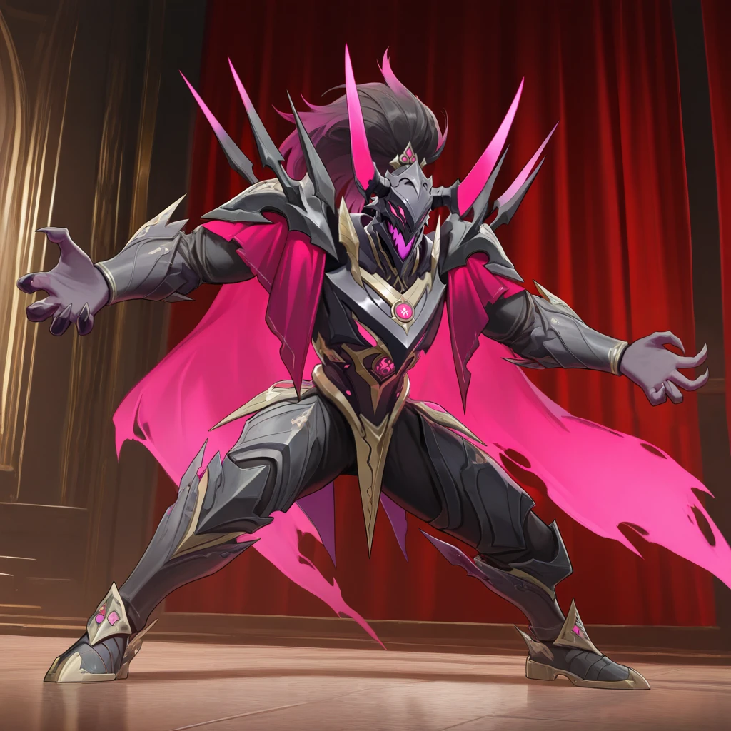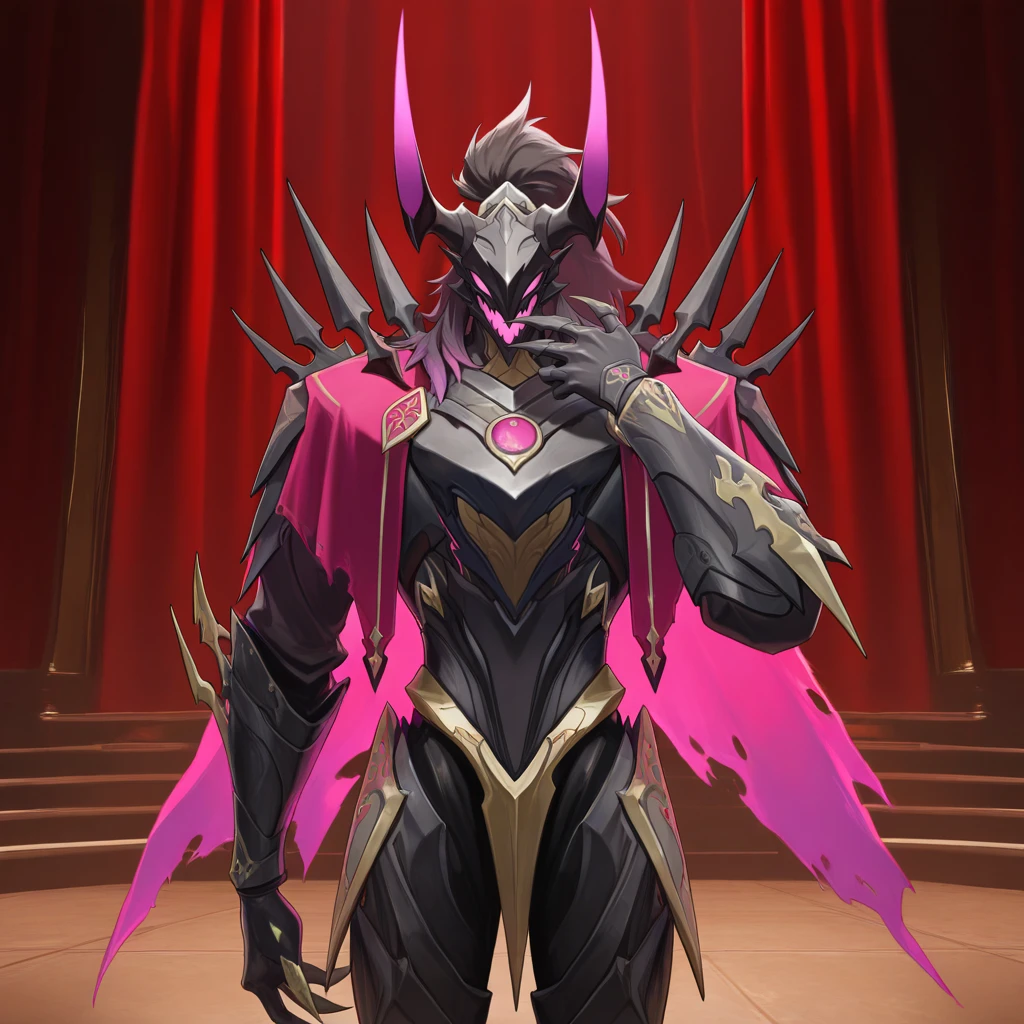 PhantasioDNA, Phs_Sbj, 1boy, male focus, monster, magenta horns, long horns, breastplate, shoulder spikes, high ponytail, masked, black hair, gradient hair, horned helmet, black armor, armor, purple feather, purple eyes, purple capelet, purple stole, torn cape, glowing cape, fangs, colored mouth, purple mouth, magenta cape, purple jewel, ????? jewel, armored collar, gold trim, claws, armored sleeves, armored pants, armored boots, black pants, black sleeves, black ????????, armored ????????, spikes,The results of your generations are dependent on the additional LoRAs, weights, and models you use, so it may not work or come out as consistent as my sample images.