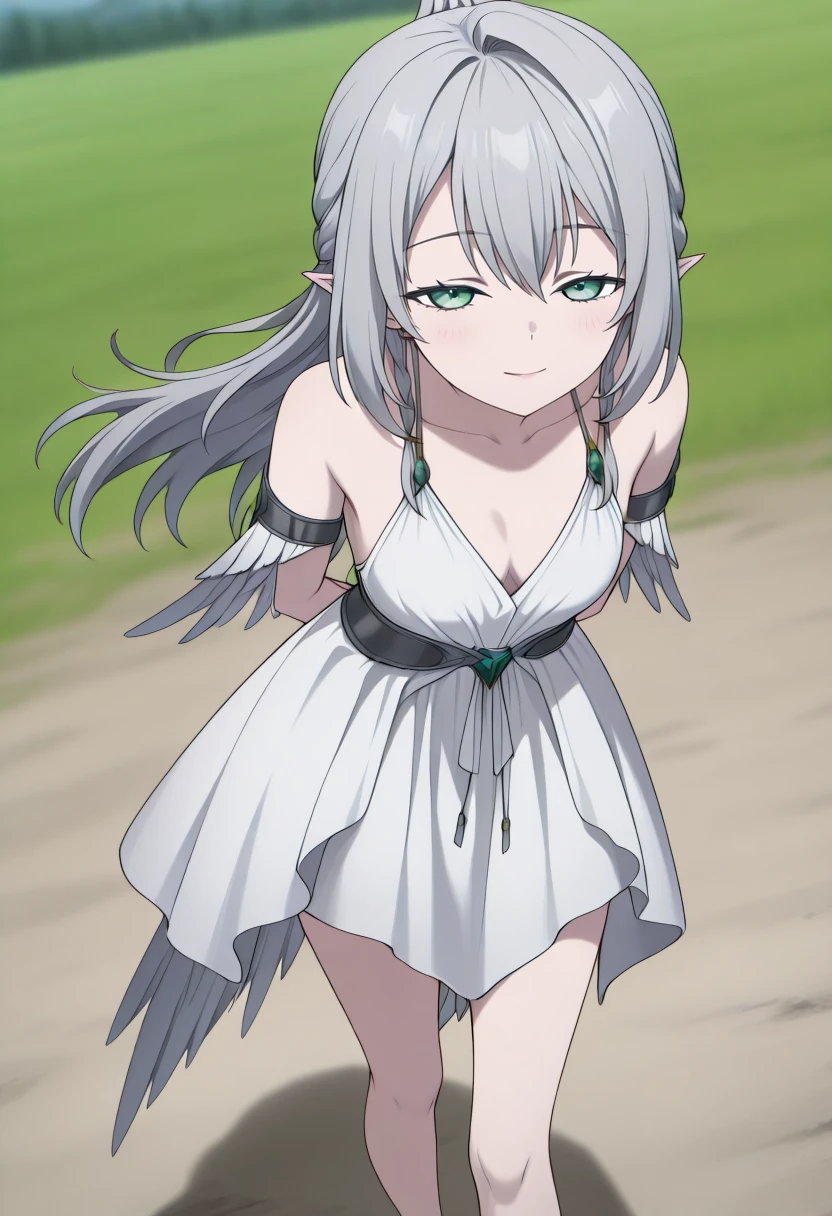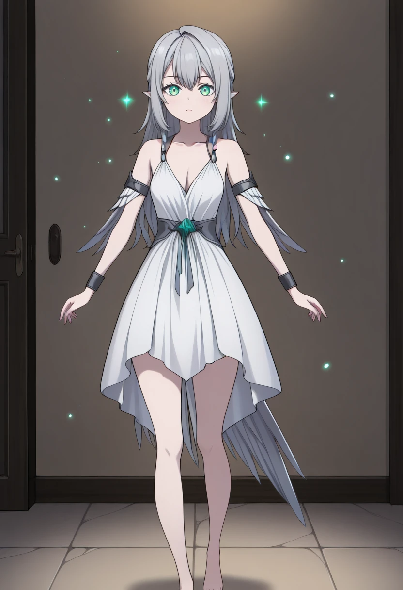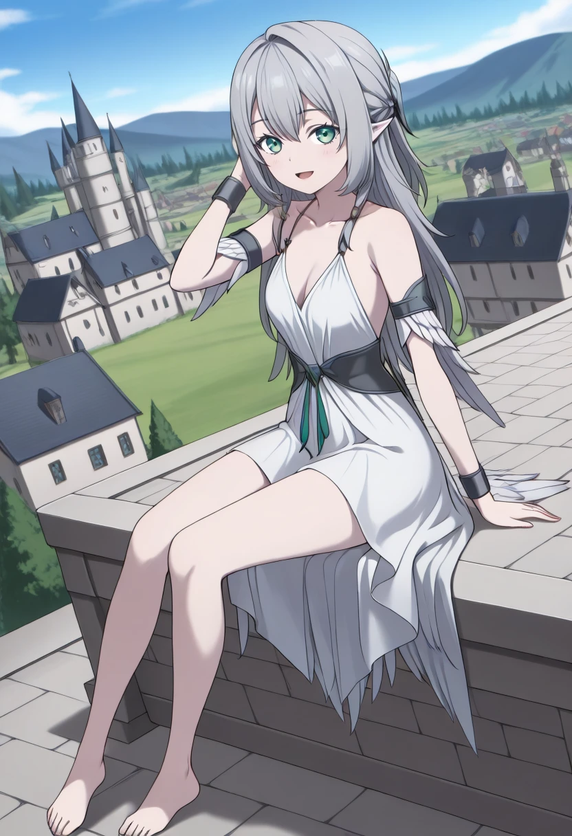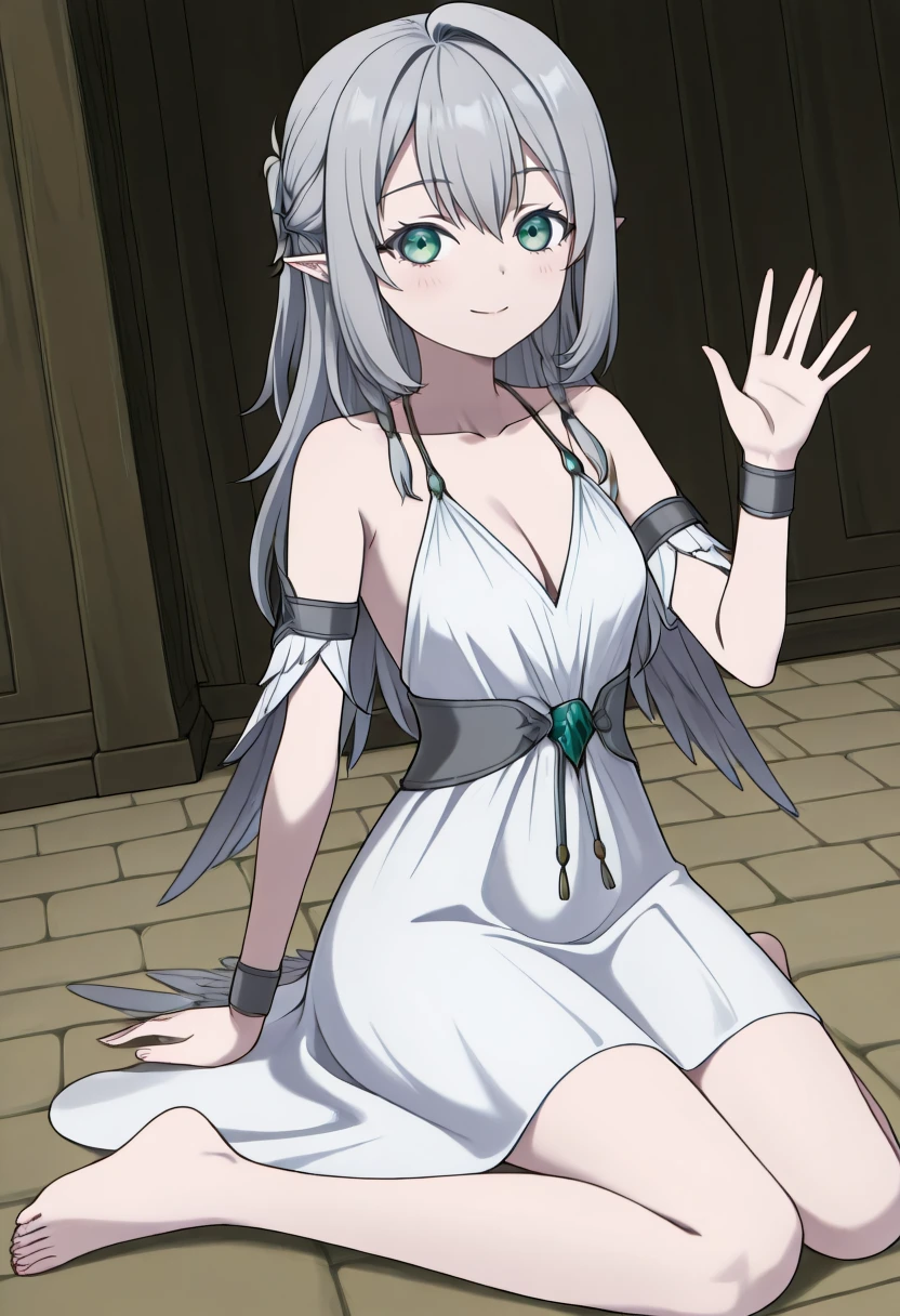 cha11v1, fantasy, angelic, white dress, winged arms, bare legs, deep cleavage, bare feet, backless, blue gem, armbands, feathered wings, anime screencap