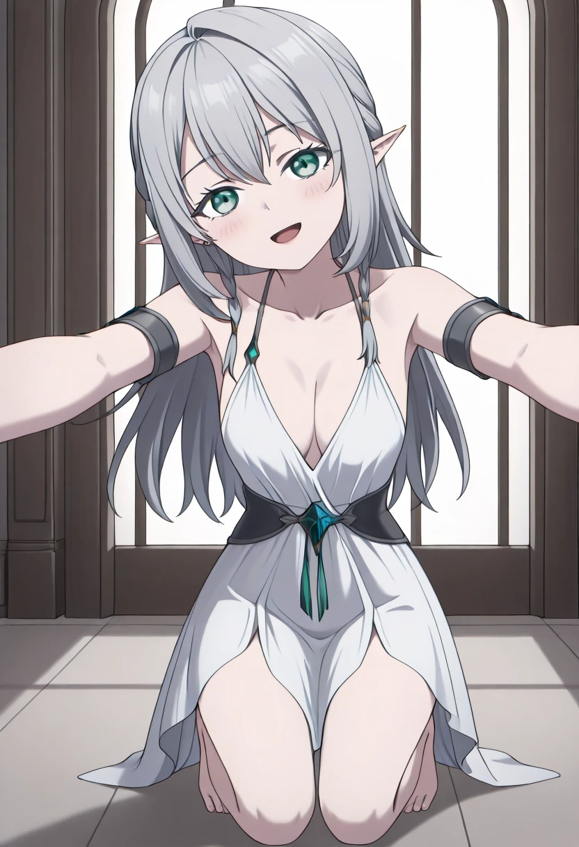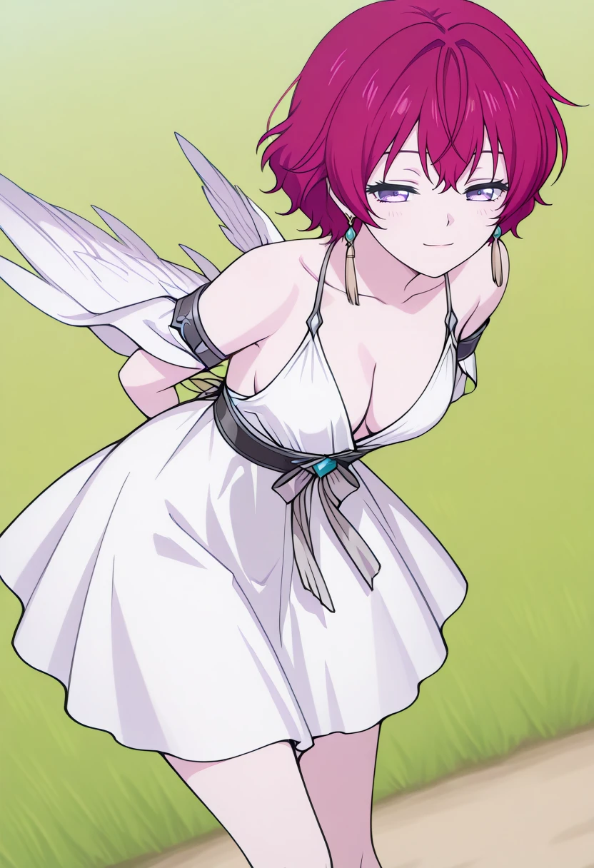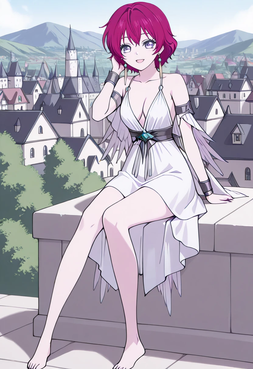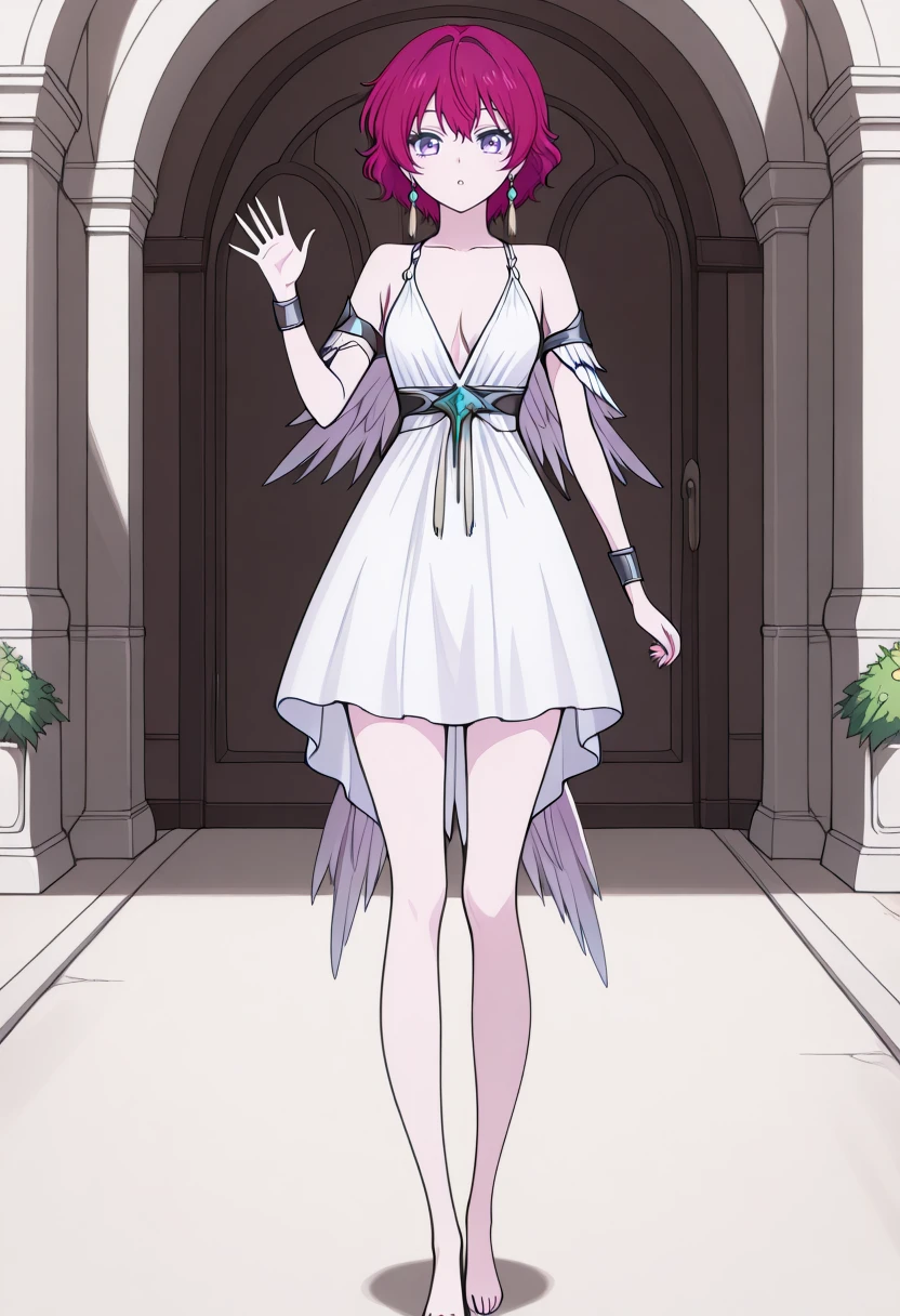 cha11v1, fantasy, angelic, white dress, winged arms, bare legs, deep cleavage, bare feet, backless, blue gem, armbands, anime screencap