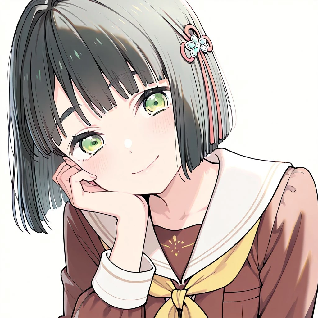 hair ornament, short hair,green eyes,black hair,bob cut