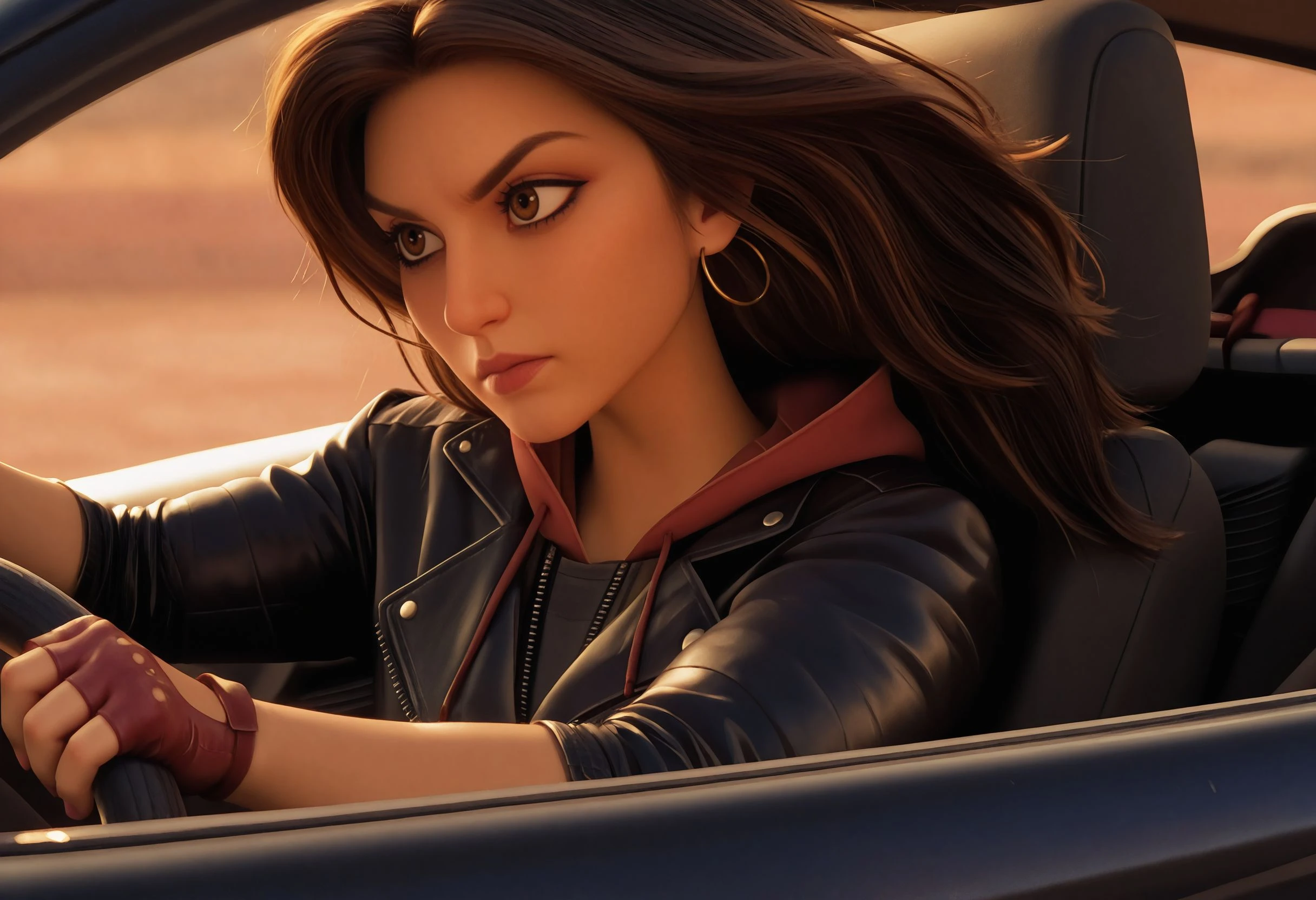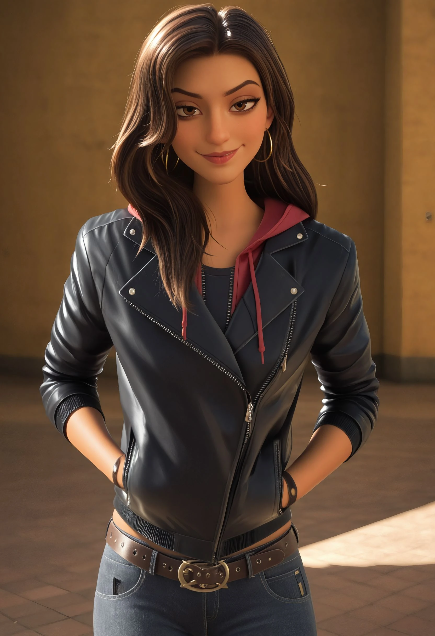 hoop earrings, red hood, hoodie, leather jacket, black jacket, fingerless gloves, red gloves, belt, pants, jeans, denim, black footwear, black boots