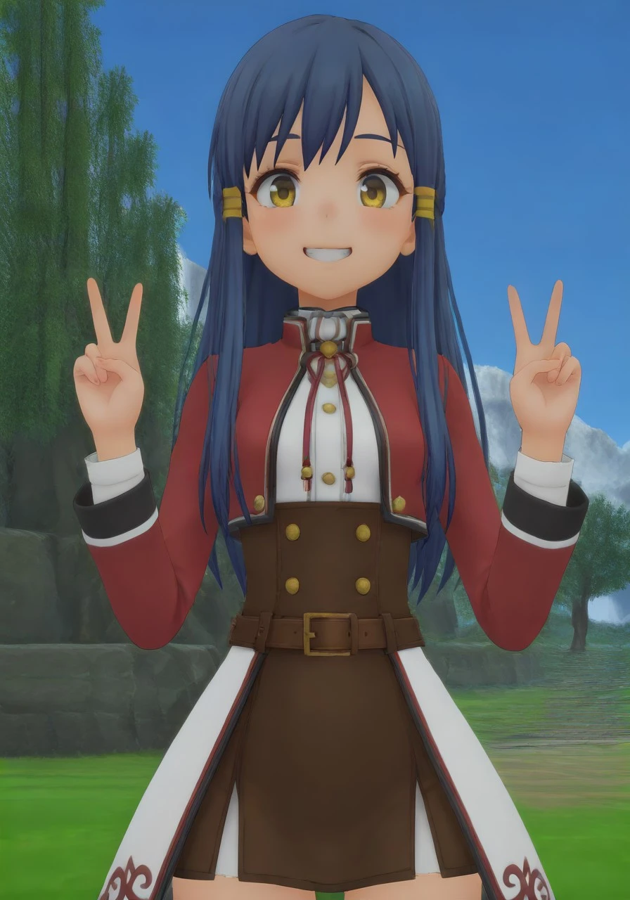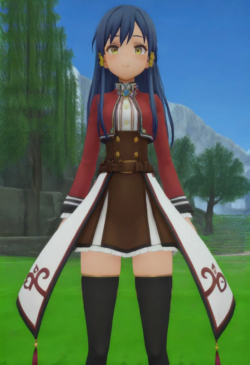 Character: HikariAlche, 1girl, solo, blue hair, long hair, yellow hair tie, yellow eyes,