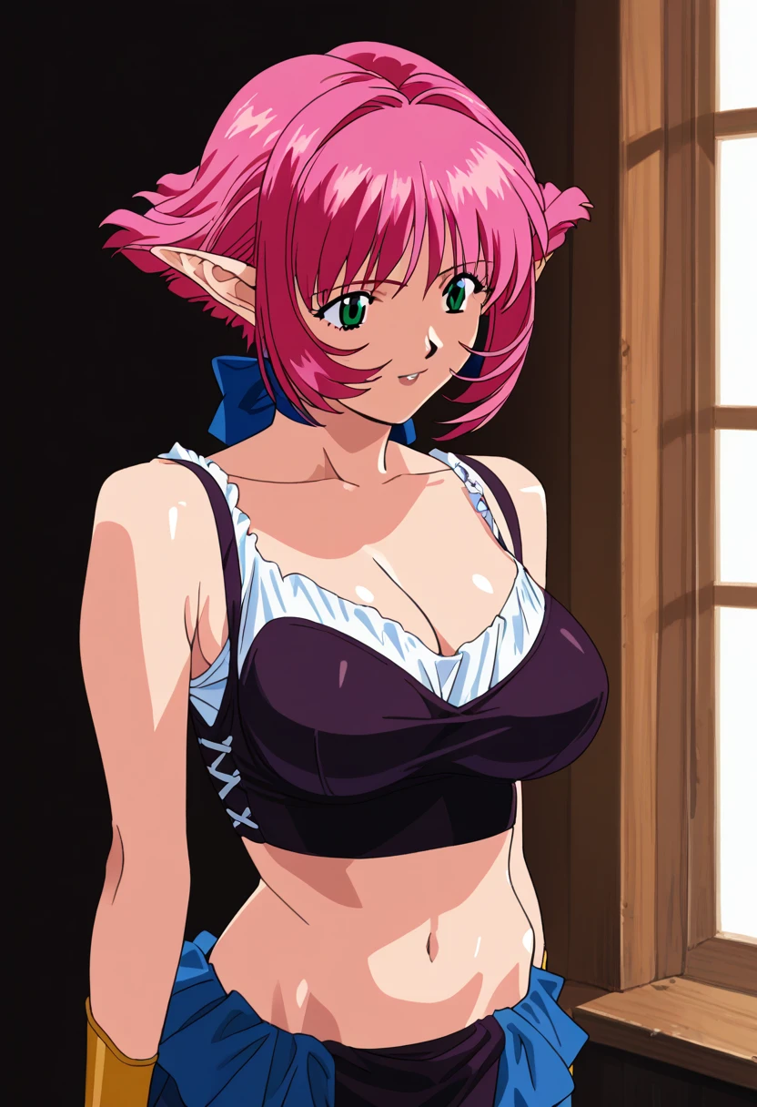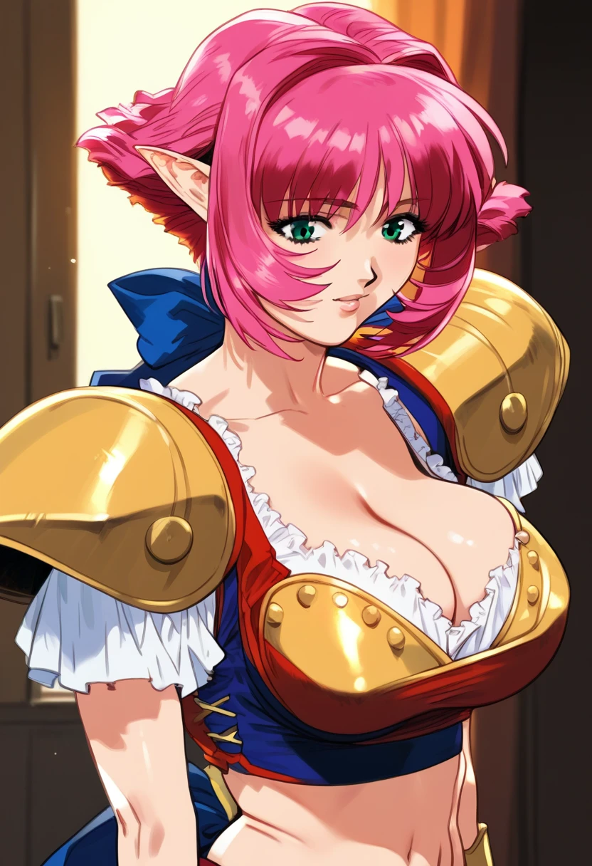 calarsr, pink hair female, green eyes female, short hair, pointy ears female, big breasts, cleavage, midriff