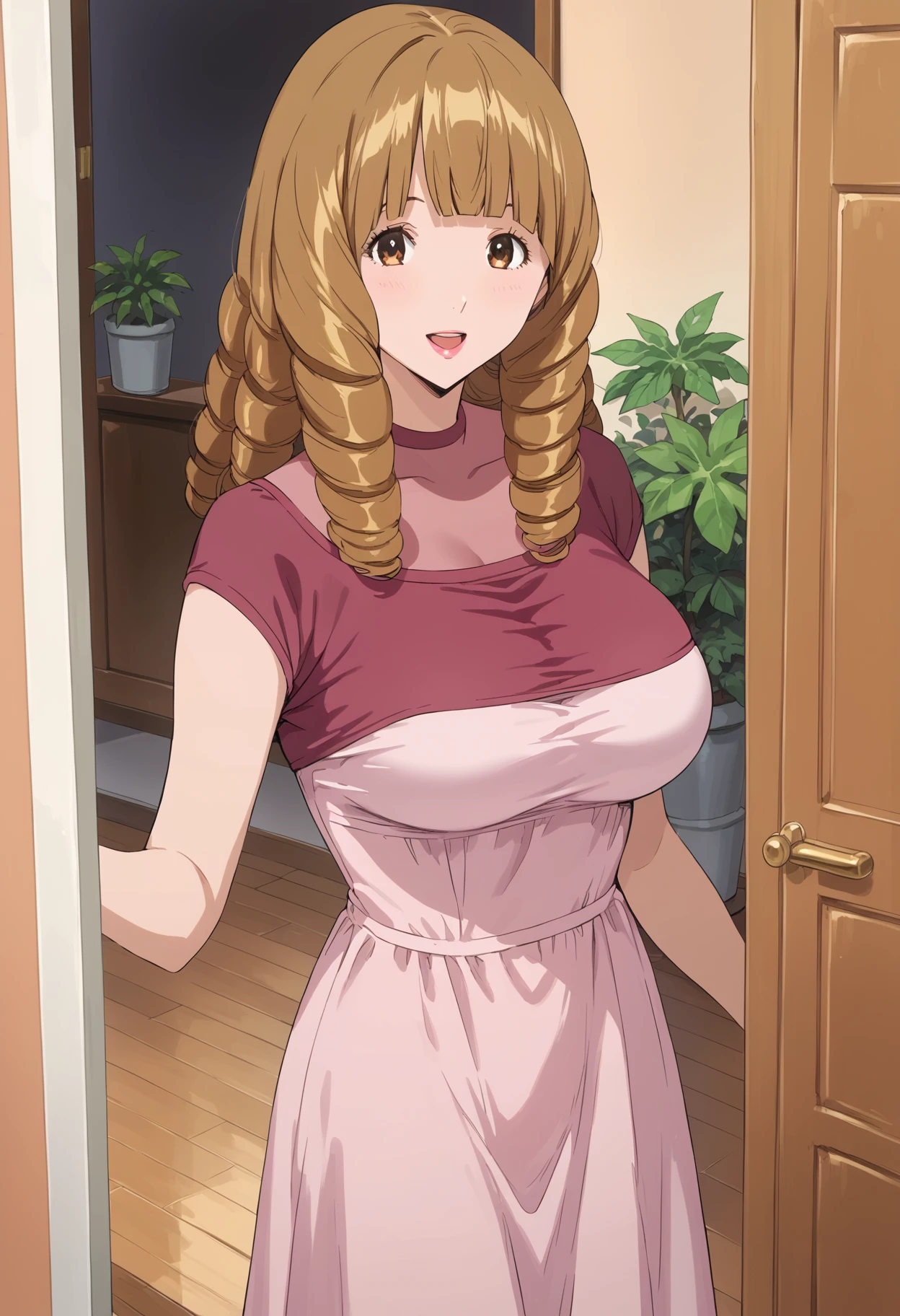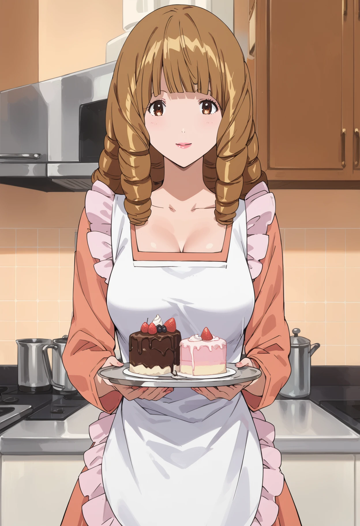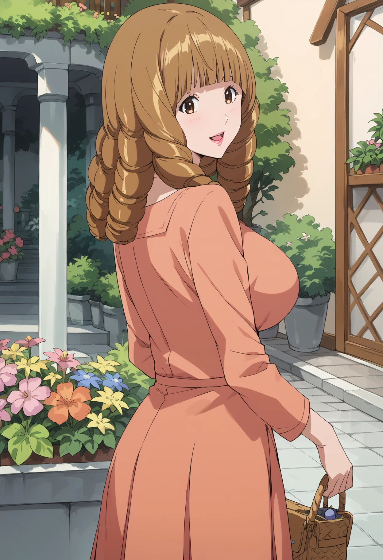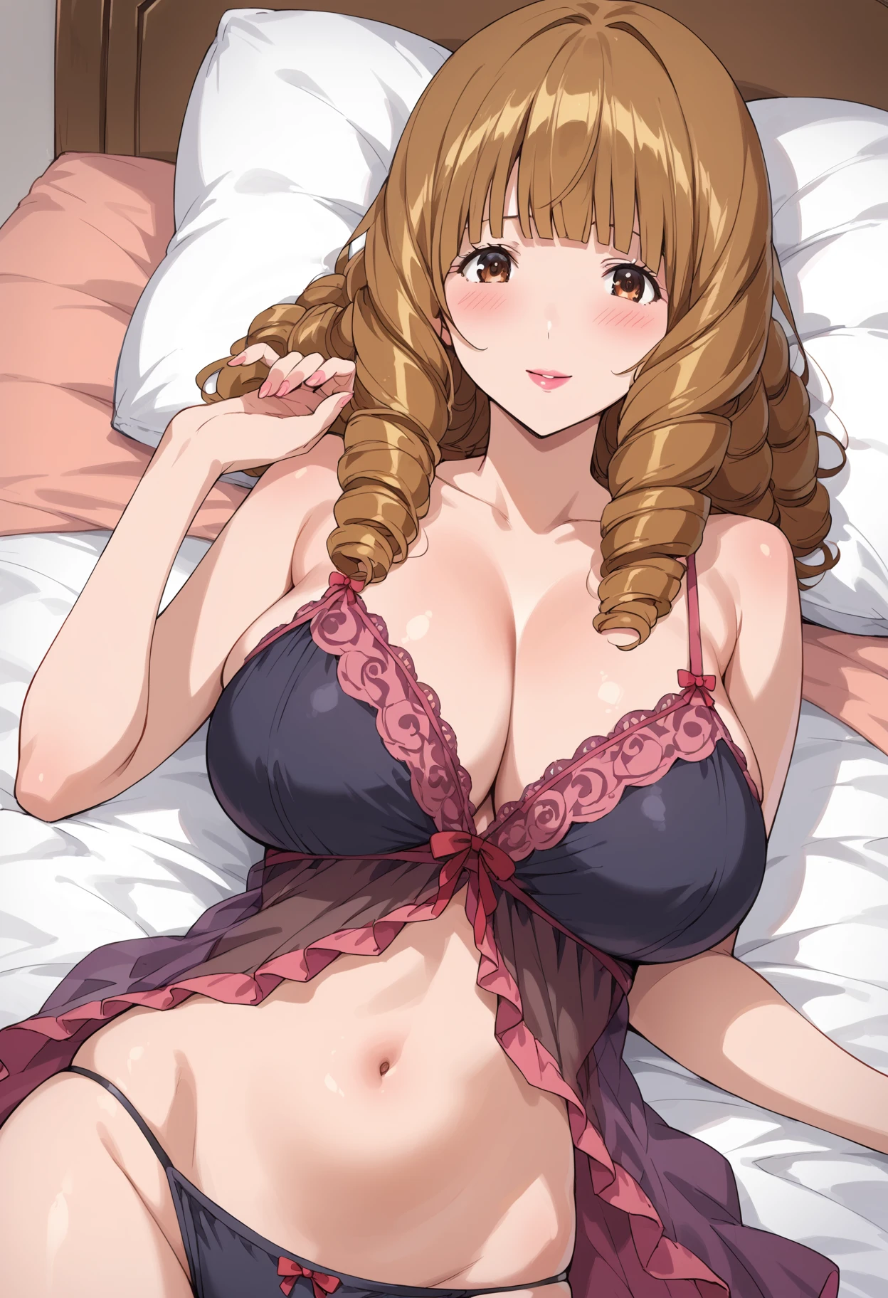 azukimama, ringlets, brown hair, brown eyes, medium hair, blunt bangs, pink lips, breasts,