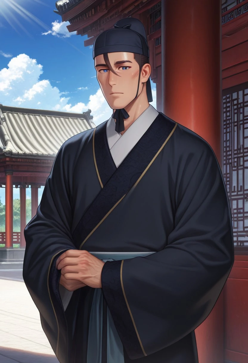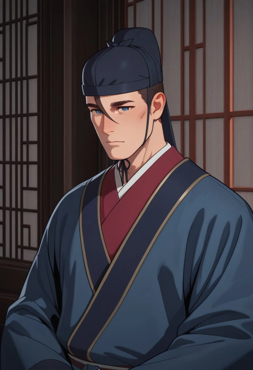costume: blue hanfu, dark blue hat