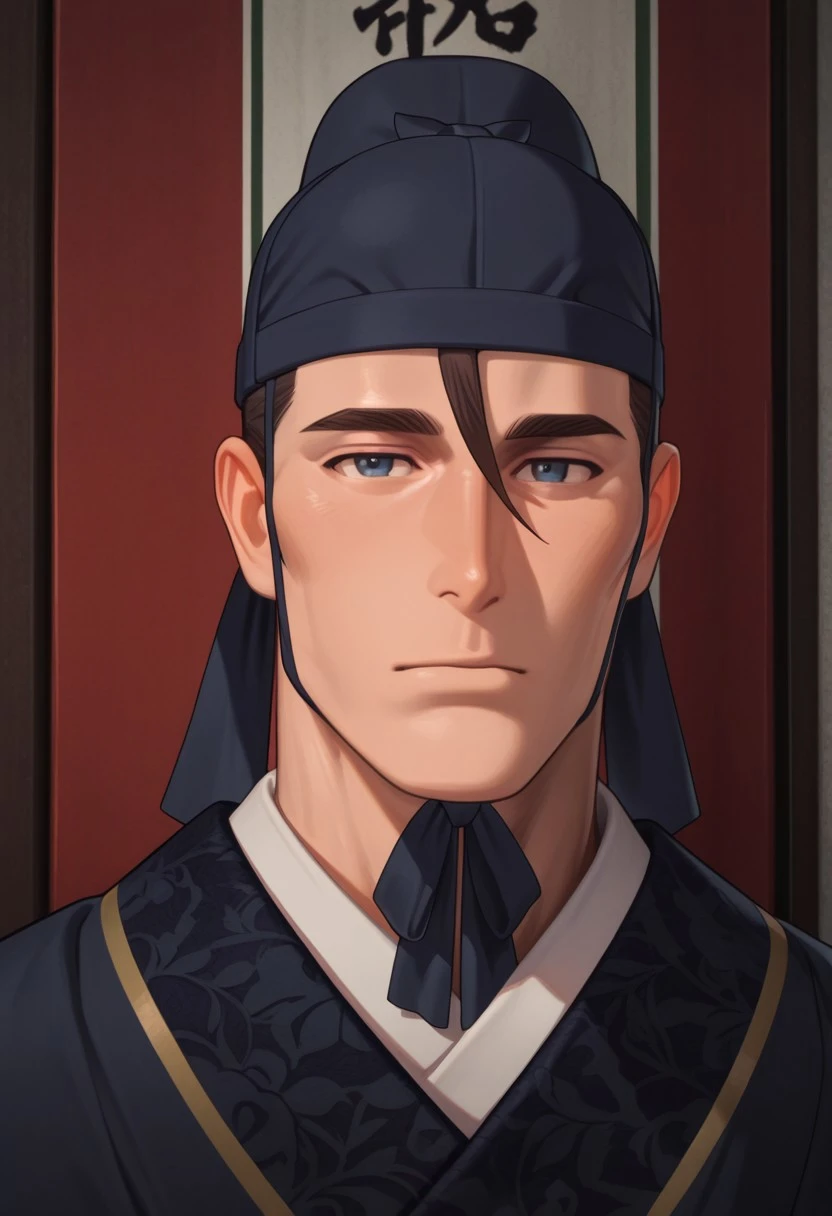 visual: 1boy, mature man, aged facial lines blue eyes, brown hair, short hair, long bangs