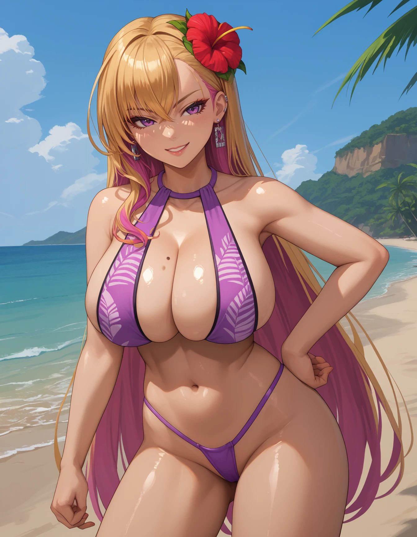 "borswm, huge breasts, blonde hair, jewelry, earrings, mole on breast, purple bikini, pink hair, purple eyes, cleavage, long hair, two-tone hair, crossed bangs, hibiscus hair flower, red hair flower, purple colored inner hair, gyaru, kogal, ,thong bikini,halterneck, flower necklace"