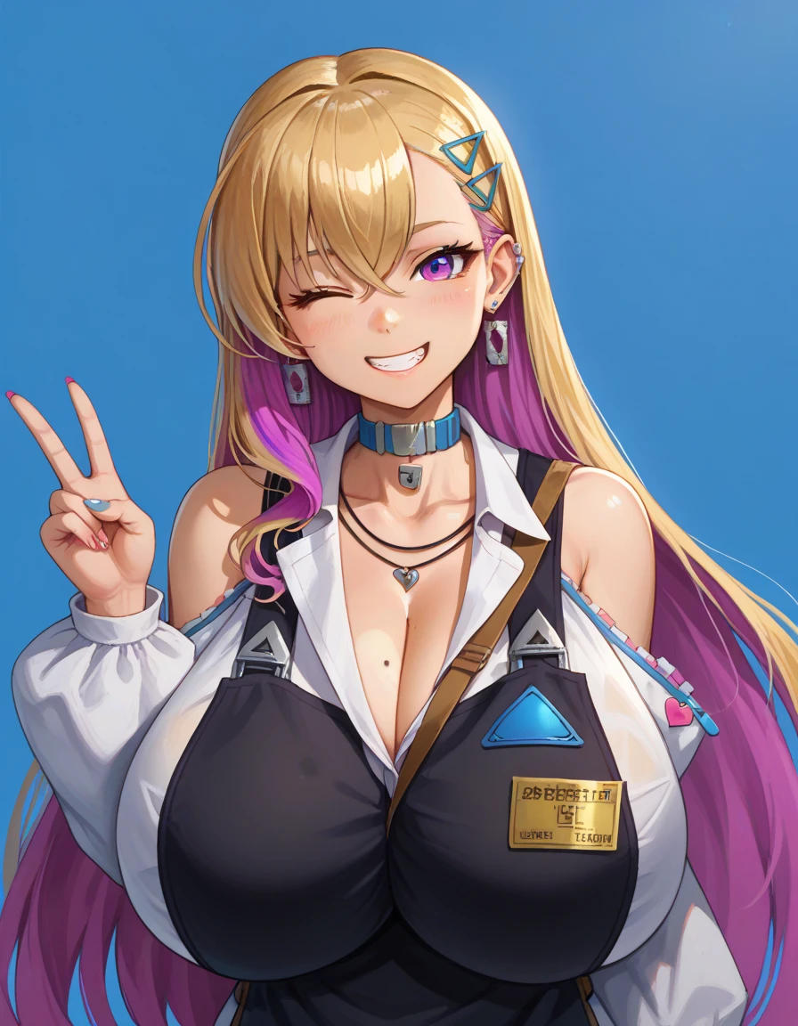 "bordef, huge breasts, triangle hair ornament, mole on breast, jewelry, blonde hair, earrings, one eye closed, smile,necklace, purple eyes, kogal, two-tone hair, long hair, cleavage, pink nails, nail polish, crossed bangs,bare shoulders, choker, multicolored nails, blue nails, detached sleeves, purple colored inner hair, collar, white shirt, black apron"