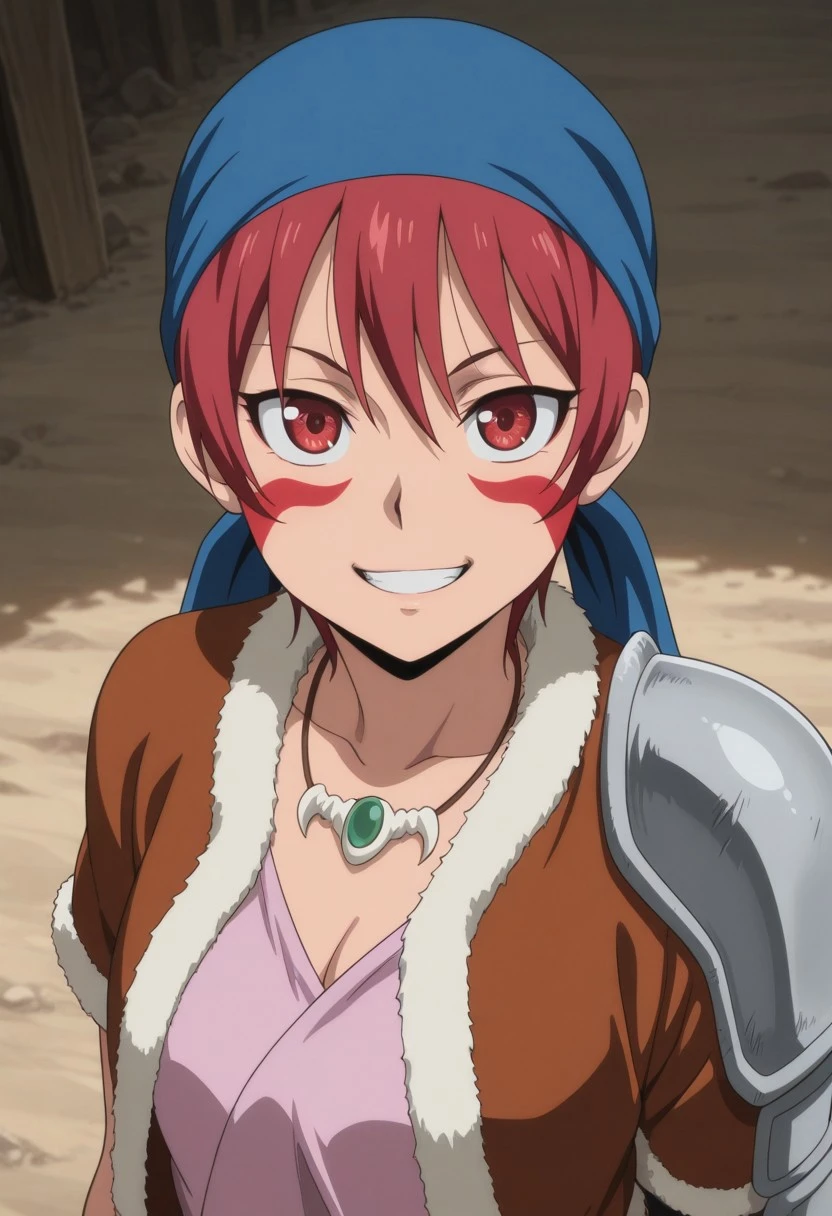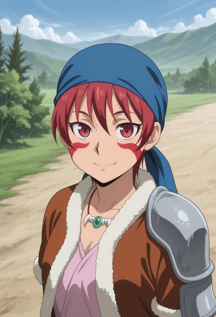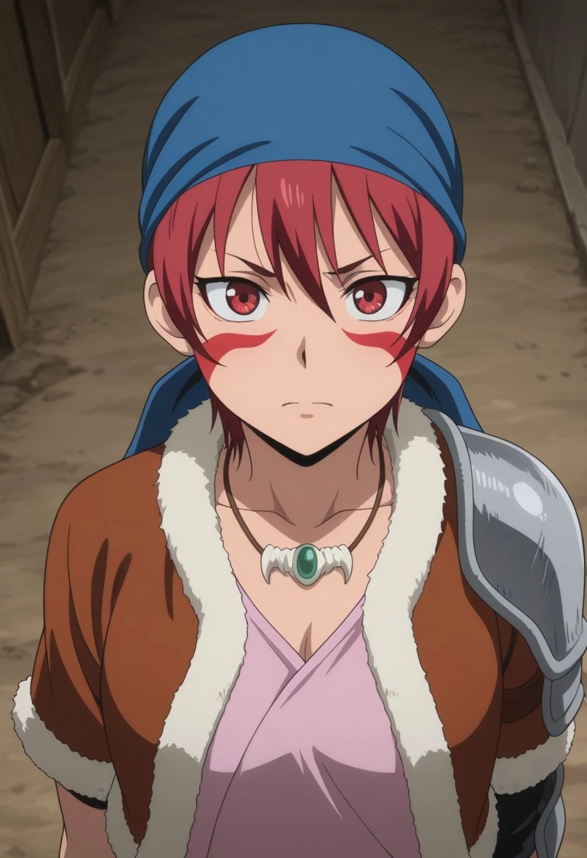 alfarid, 1girl, solo, facepaint, red eyes, red hair, blue bandana, necklace, pink shirt, brown jacket, fur trim, shoulder armor, belt, brown shorts, holster, green sarong, boots, brown footwear,