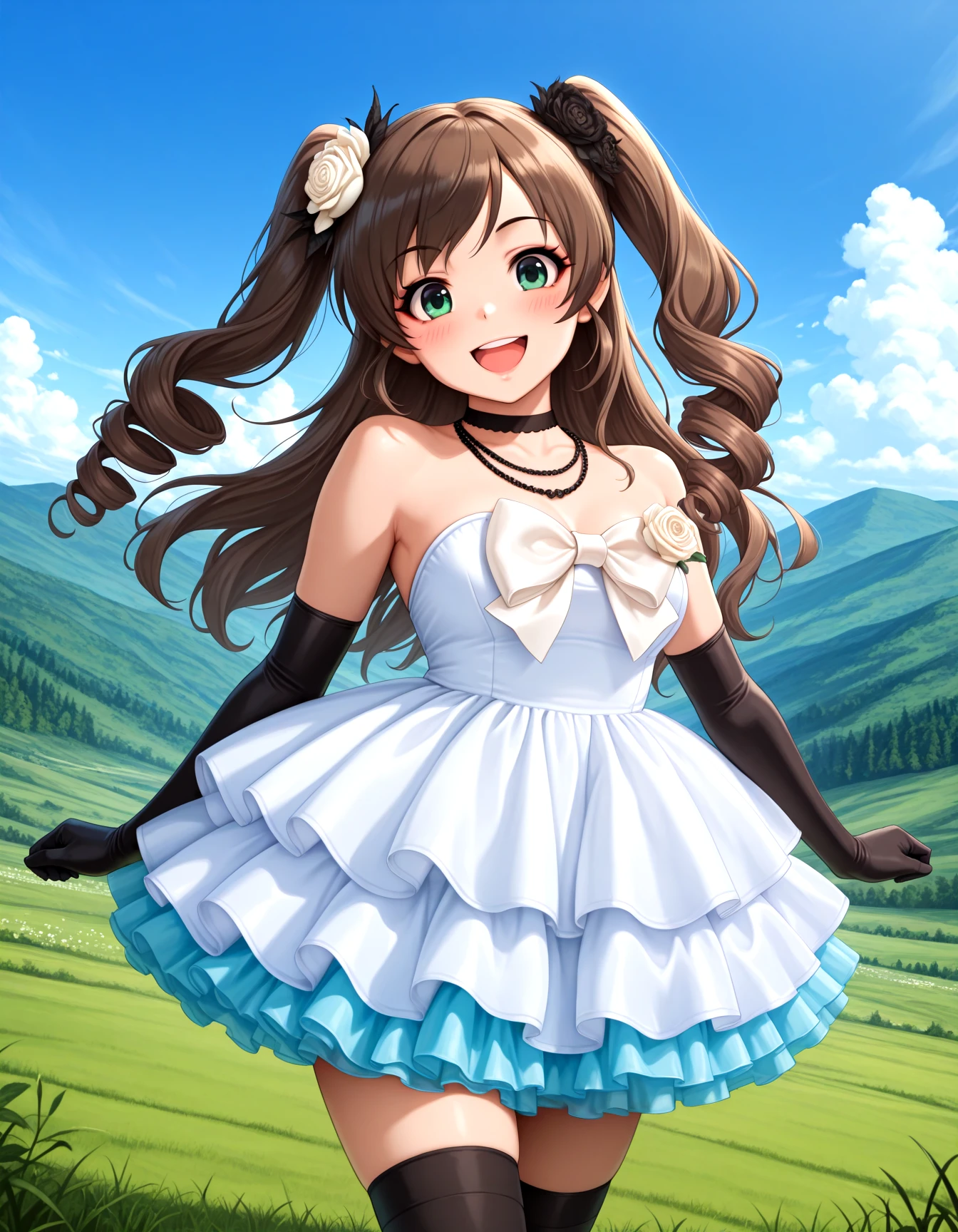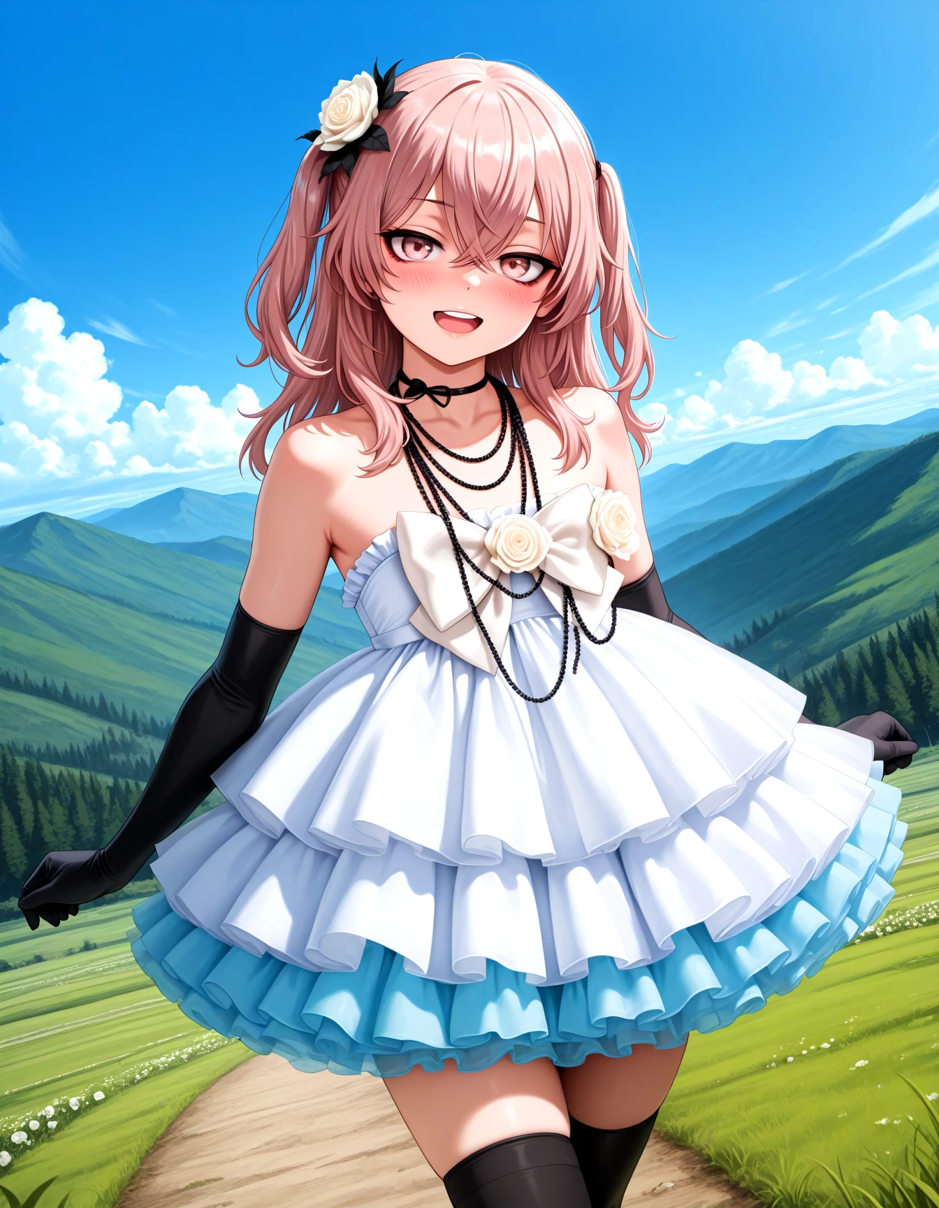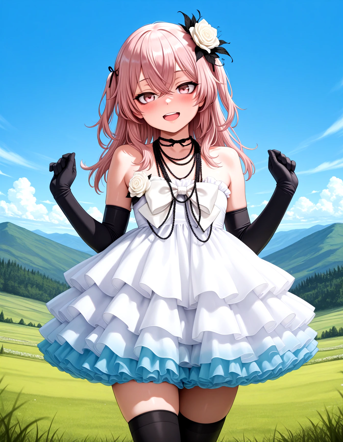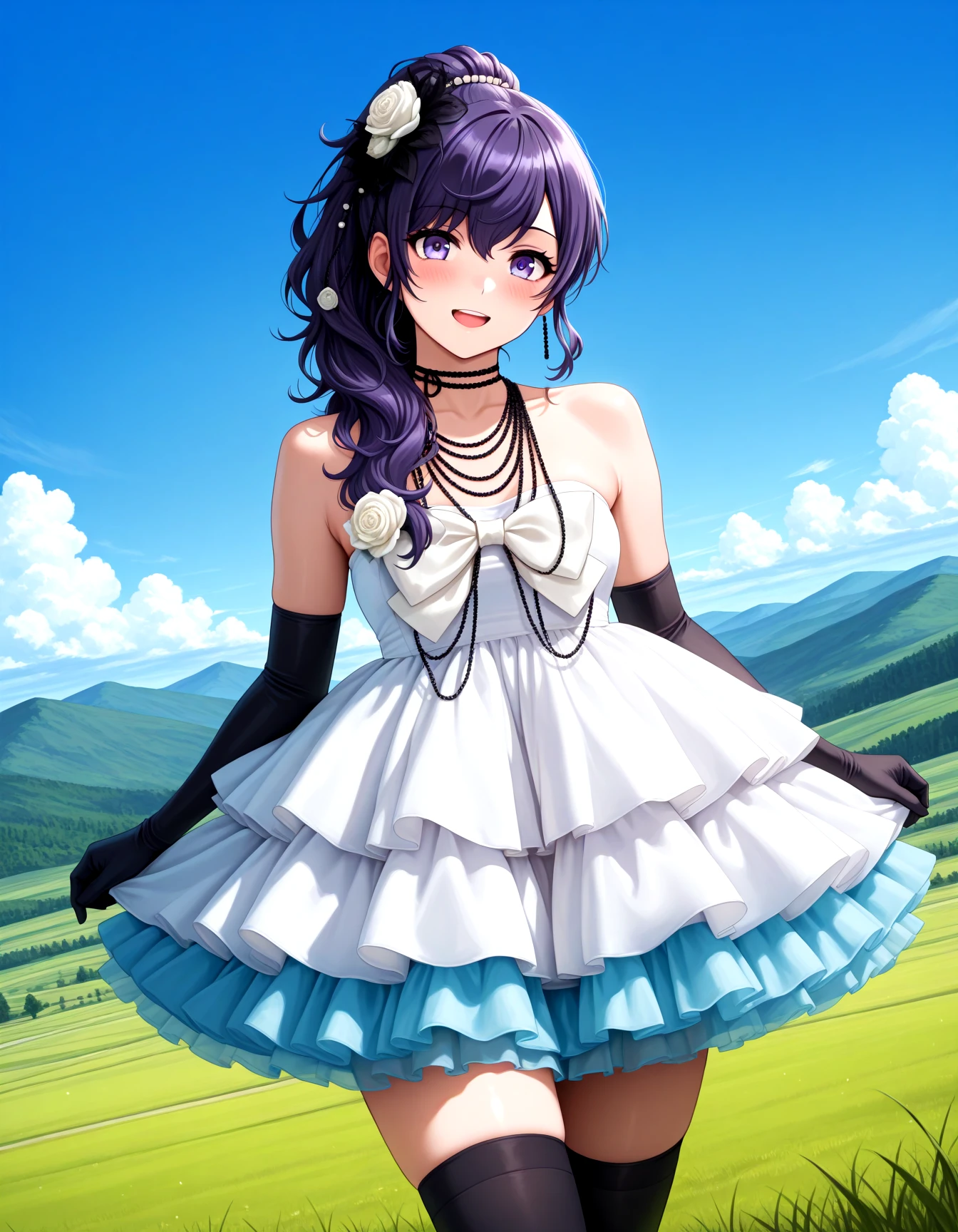 MIC1AMELL, dress, white dress, strapless dress, frilled dress, layered dress, tutu, bare shoulders, black elbow gloves, hair ornament, jewelry, necklace, hair flower, white rose, beads, choker, white bow, white chest bow, black thighhighs, zettai ryouiki, high heelsDescription