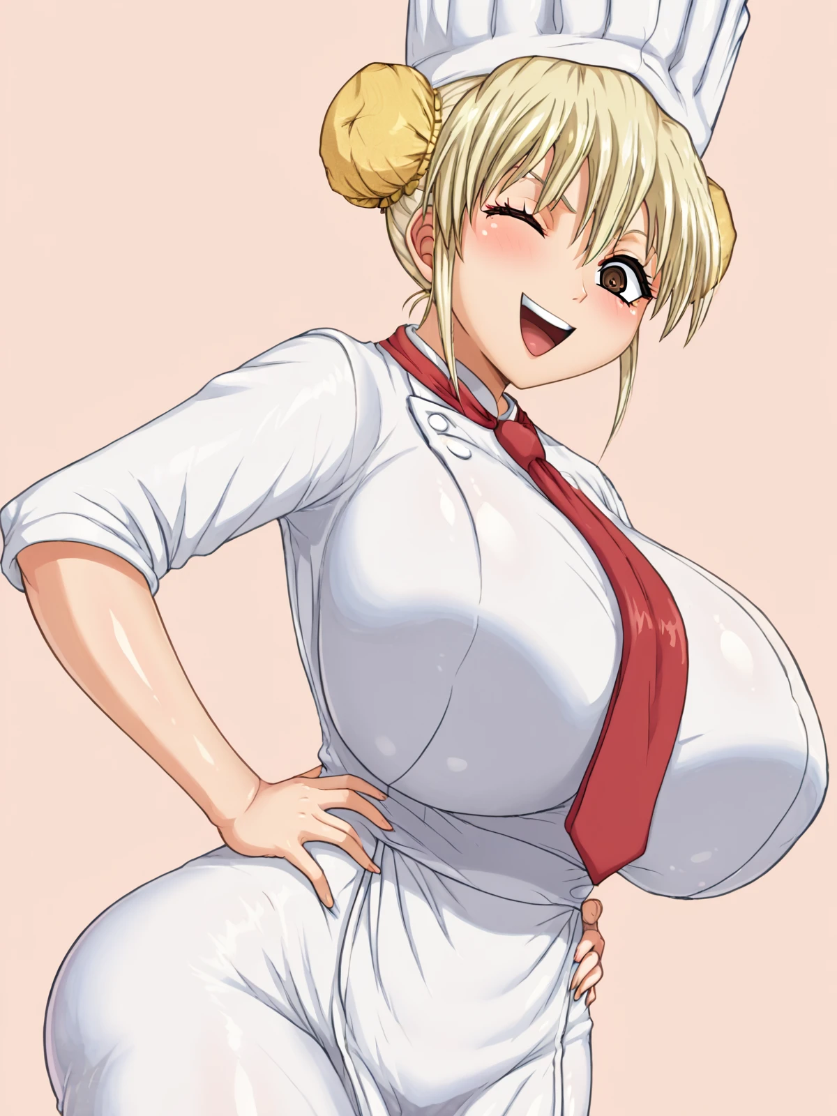 kiriko_chef,chef,chef hat,hair bun,necktie,double bun