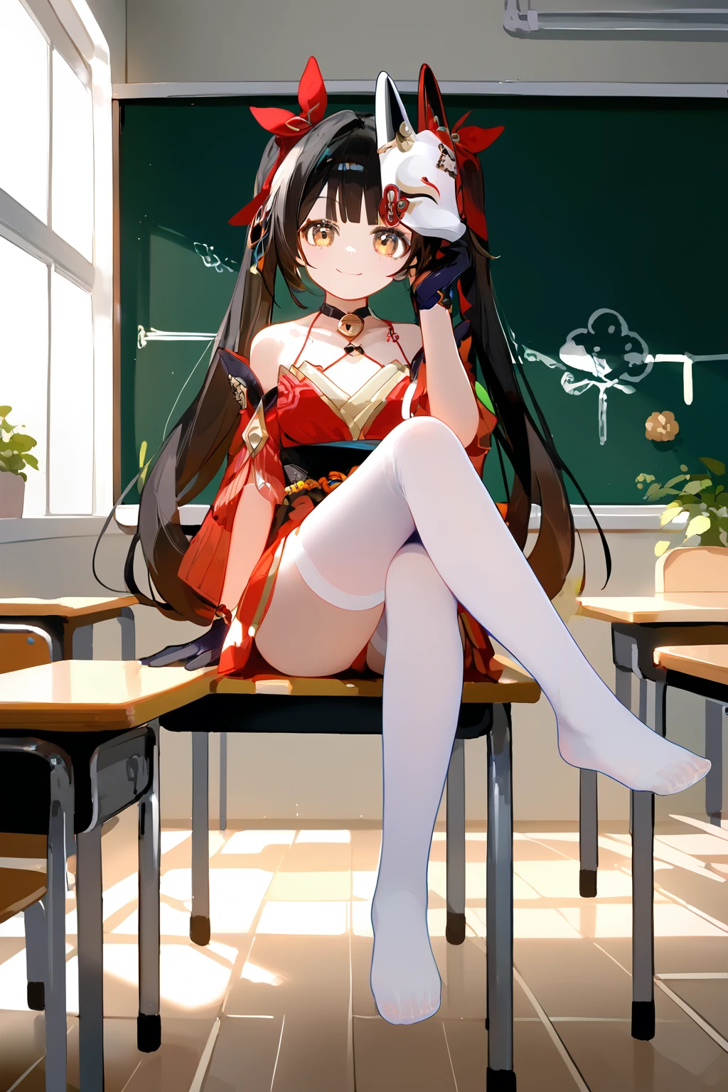 bangs,bare shoulders,bell,black hair,black glove,fox mask,hair ribbon,japanese clothes