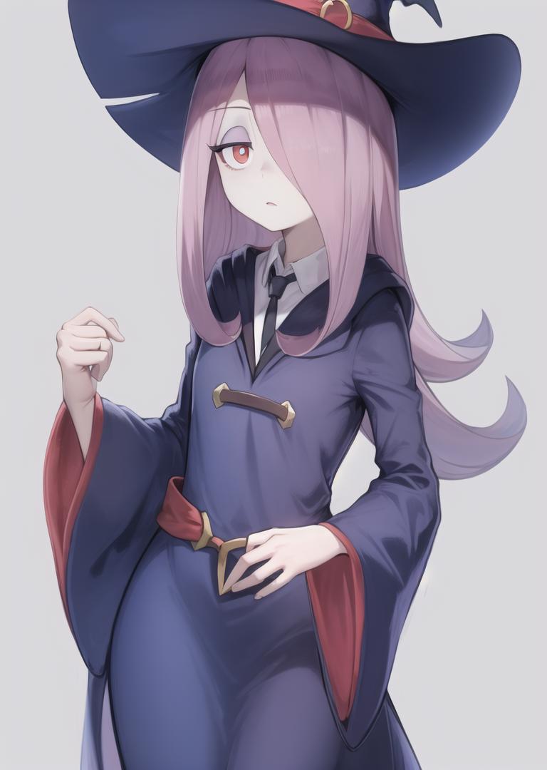 Sucy-based Lora. Works well according to my tests. If you want a hatless Sucy then simply add (witch hat:1.3) the negatives. If that doesn't work, just start randomly adding and removing hat and headwear tags until it gives you hatless Sucy. For the most part, the former works fine though. Use "Sucy" in the start of the prompt to make it adhere more to her actual look. Otherwise it starts to look slightly inaccurate. Also, if you try hard enough, you can deviate her normal color palette in favor of other outfits.