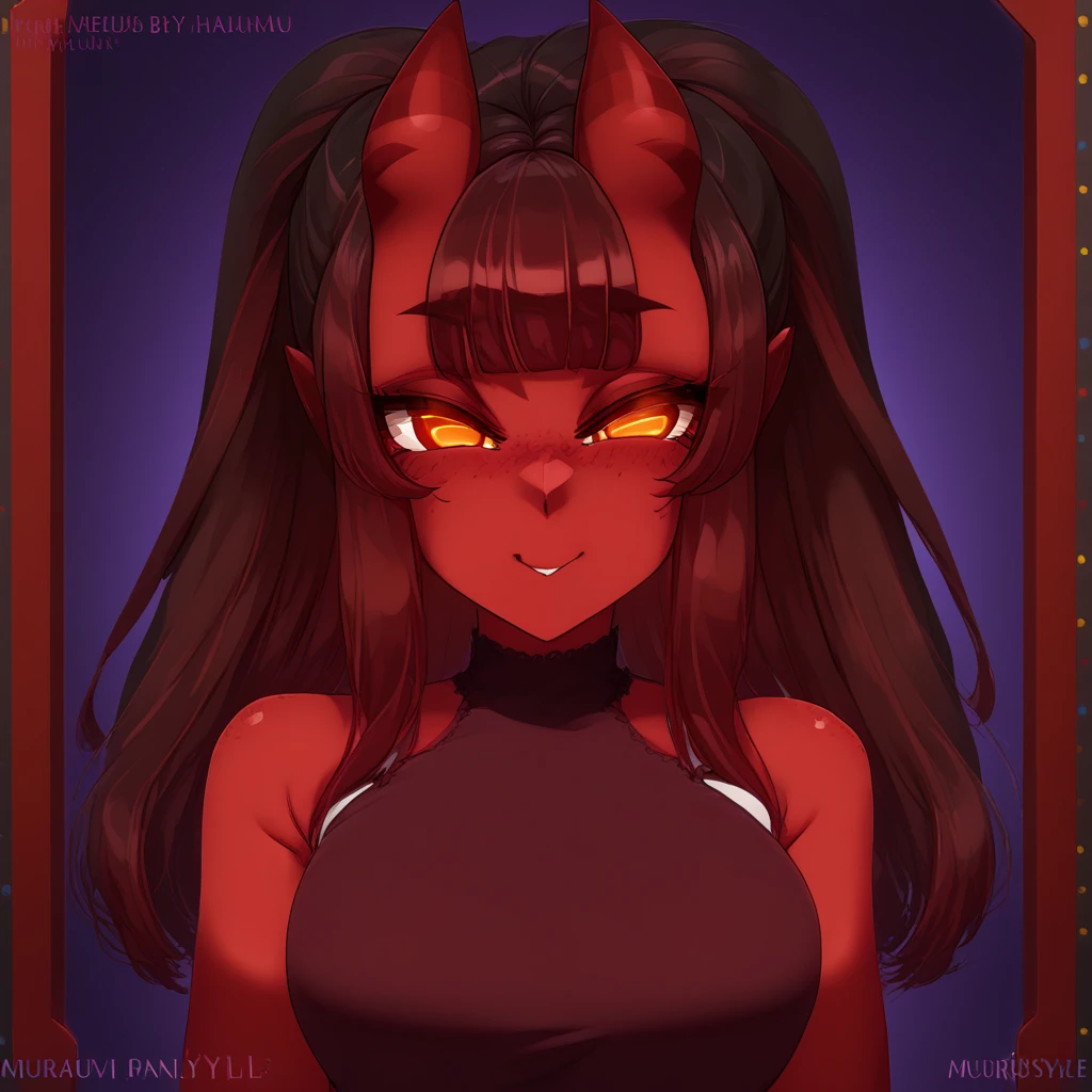 meru, merunyaa, meruccubus, red oni, colored skin, red skin, pointy ears, long hair, mole, oni, blunt bangs, hips window, big hips, big tits, small waist, cleavage, freckles,