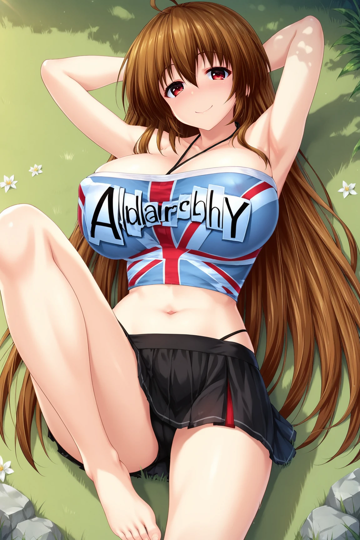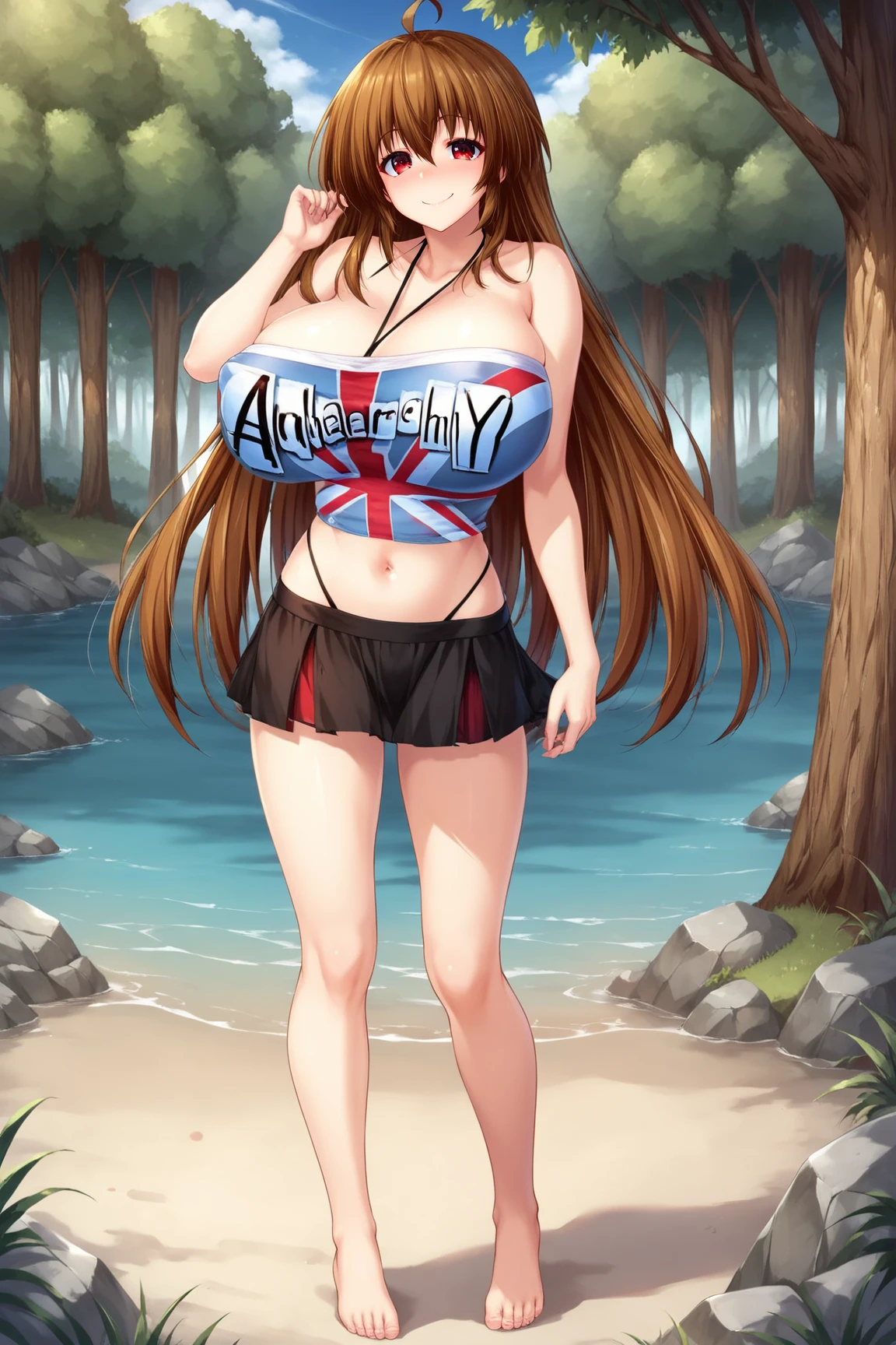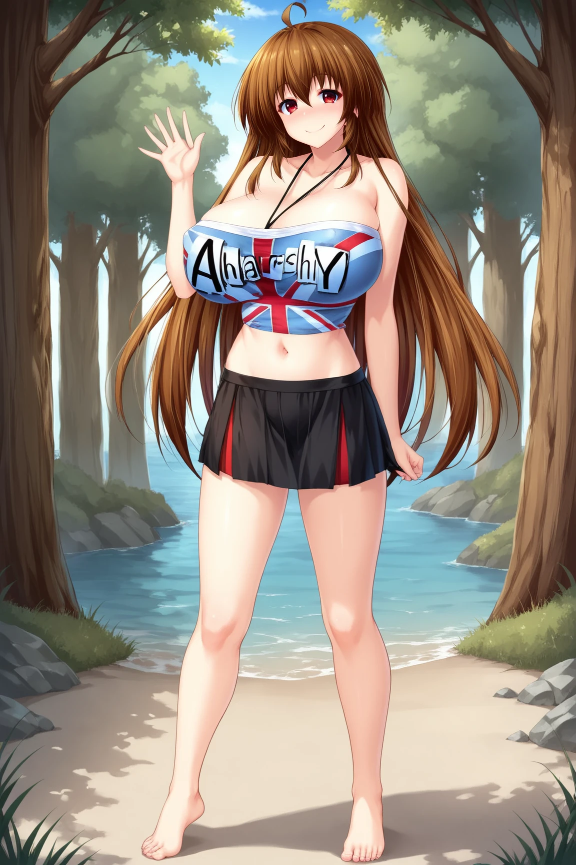 NanamiOderaSRPXL, red eyes, brown hair, long hair, hair between eyes, bangs, ahoge, huge breasts, bare shoulders, halterneck, blue midriff, union jack, miniskirt, black skirt, barefoot