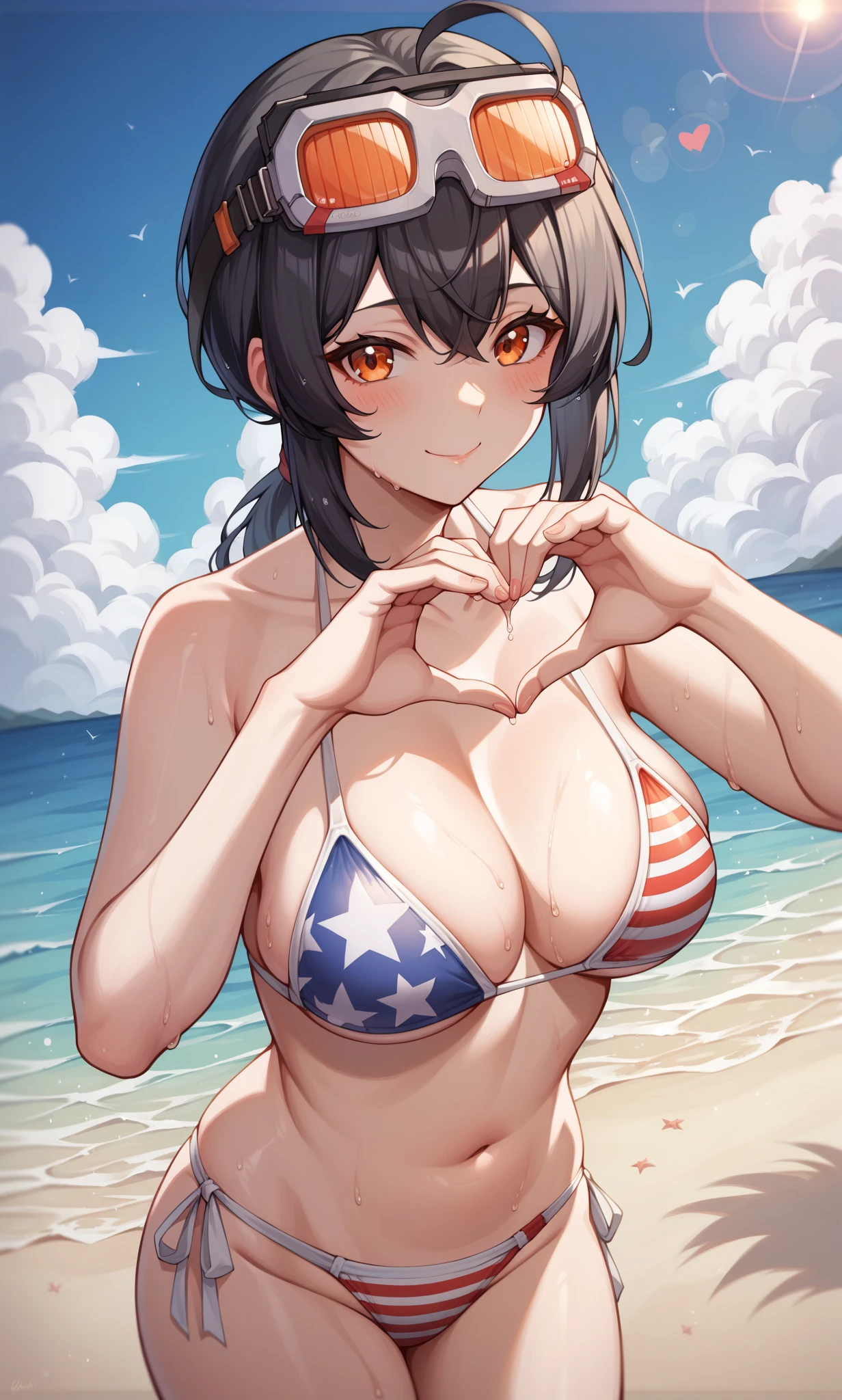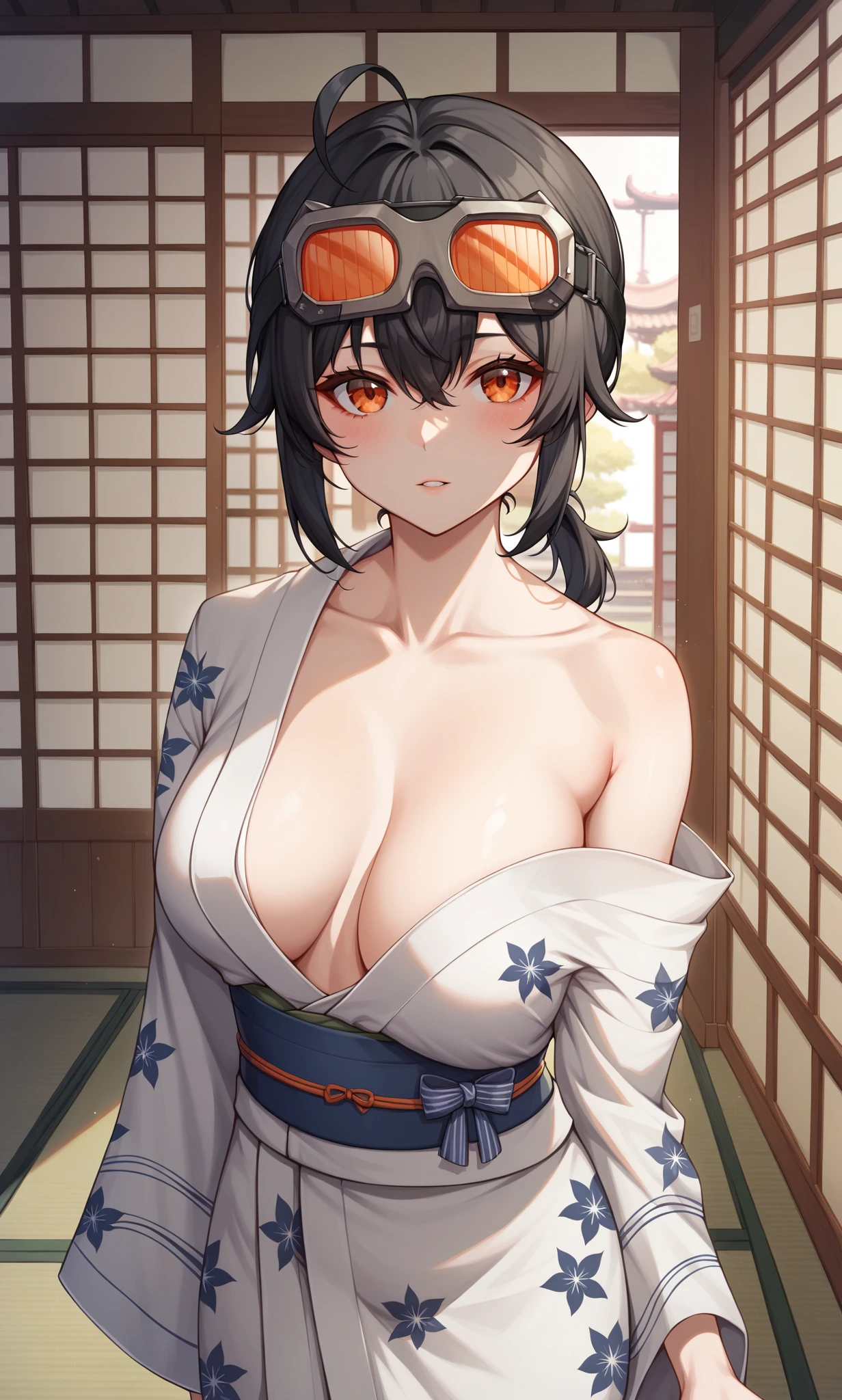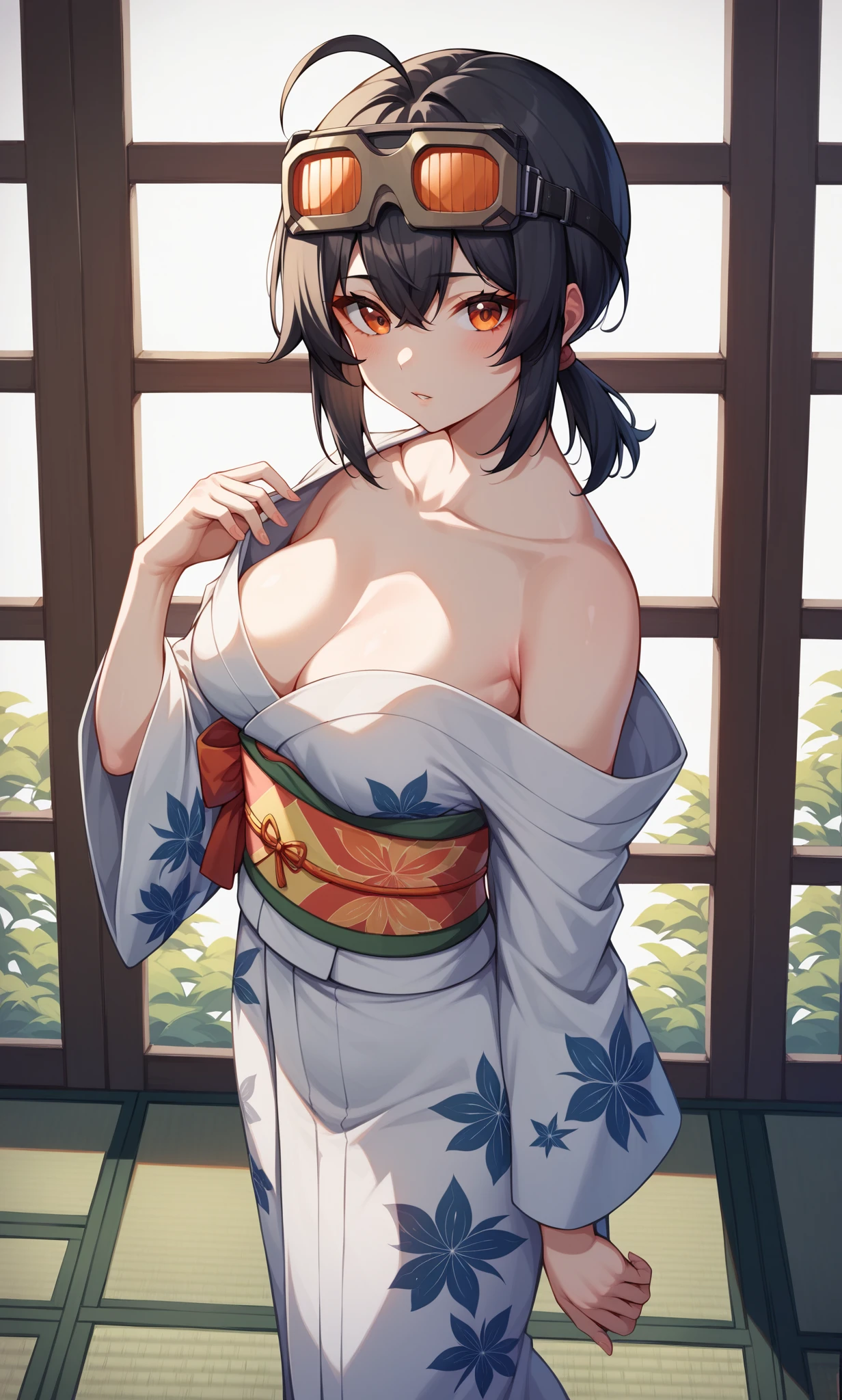 grace, orange eyes, black hair, short hair, low ponytail, ahoge