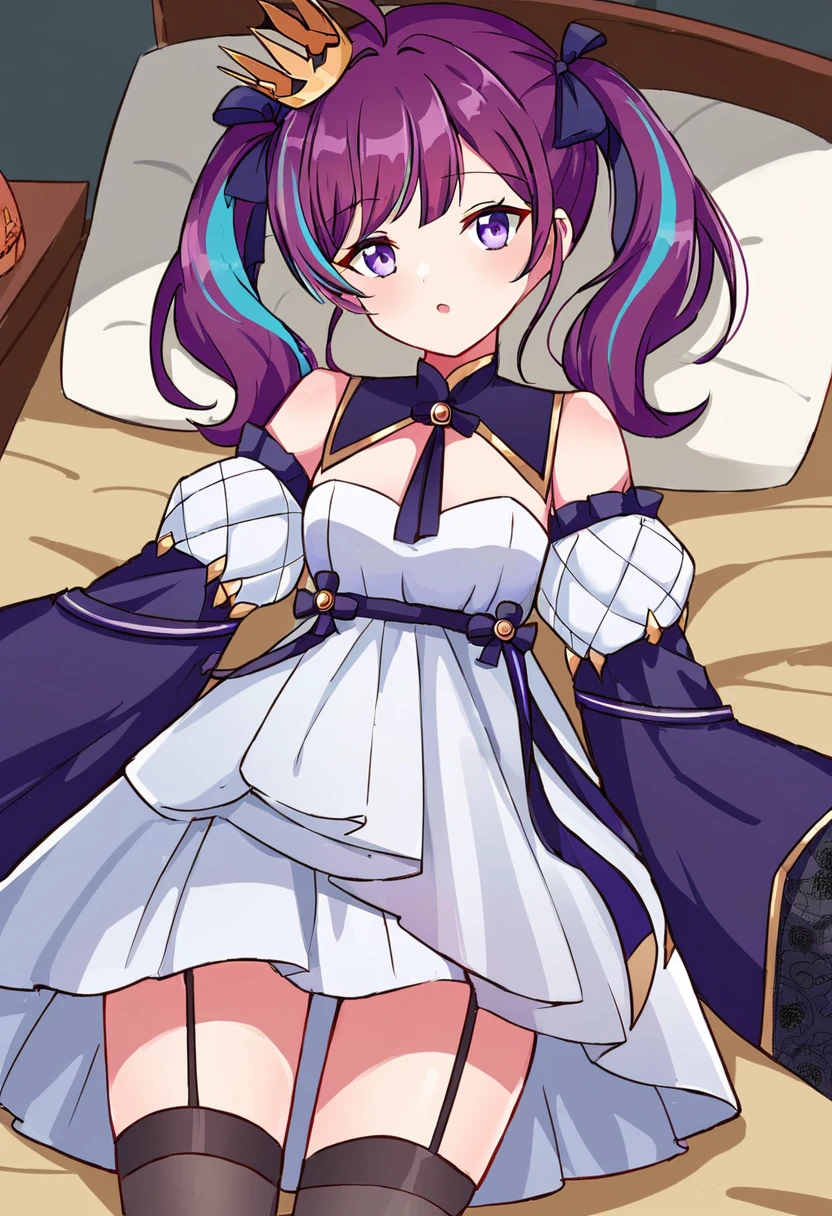 1girl,multicolored hair,purple hair,bangs,detached sleeves,crown,dress,streaked hair,white dress,ribbon,ahoge,bare shoulders,purple eyes,bow,breasts,long sleeves,hair ribbon,two-tone hair,mini crown,puffy sleeves,thigghighs,wide sleeves,garter strapes,black ribbon,black thigghighs, short twintails