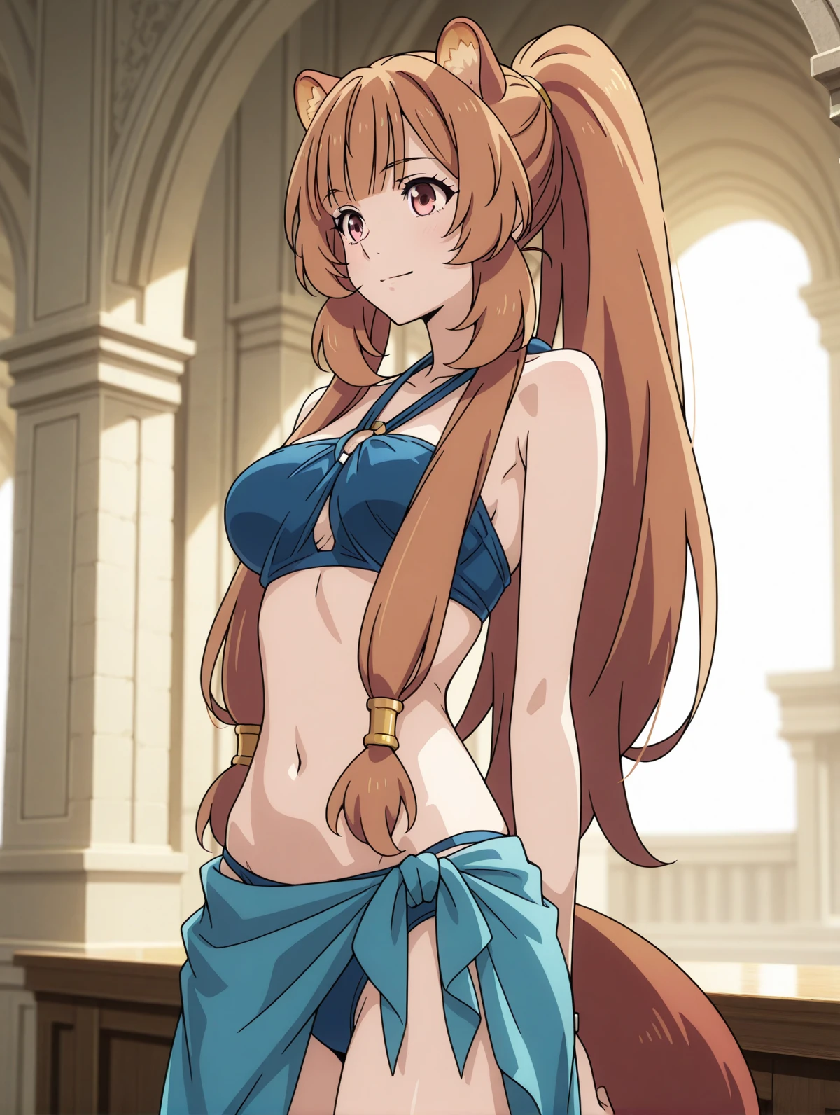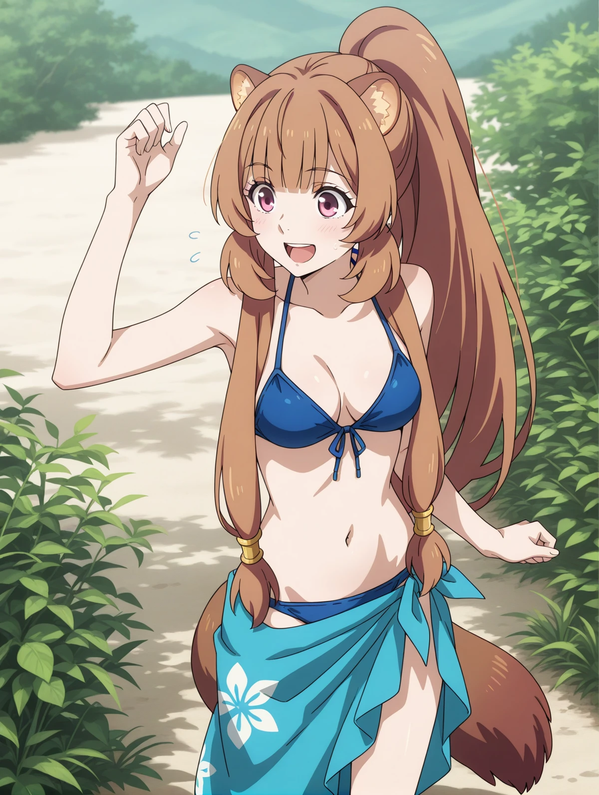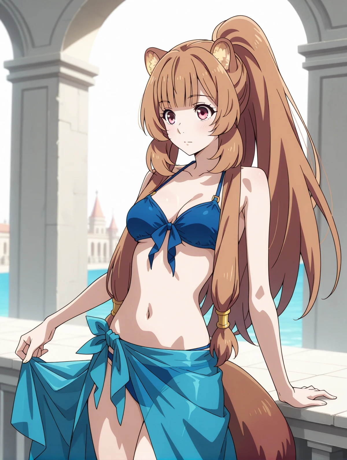 blue bikini sarong ponytail