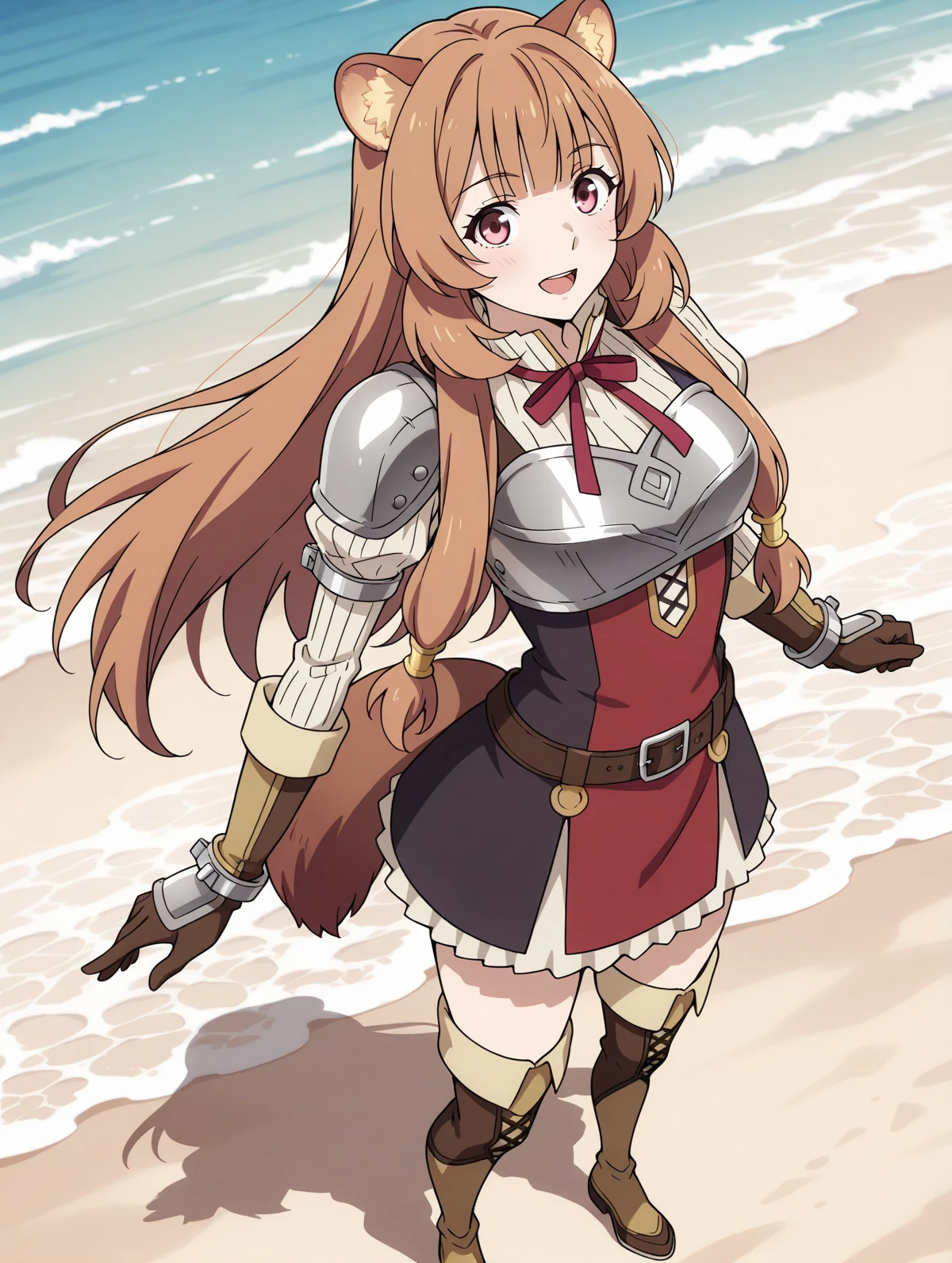 red dress striped sweater red neck ribbon breastplate belt brown gloves thigh boots