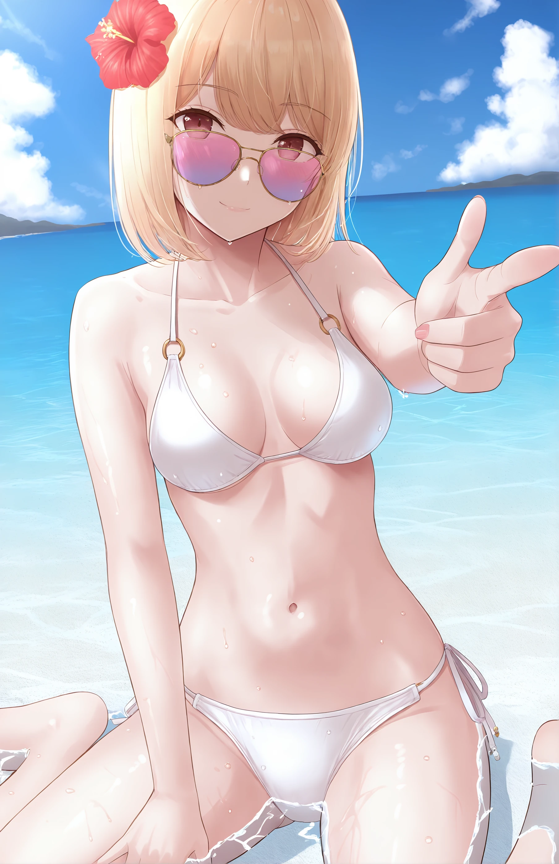 NicoleNinagawa, , short hair, bangs, blonde hair, hair ornament, navel, , collarbone, swimsuit, flower, , hair flower, stomach, side-tie bottom, white , tinted eyewear