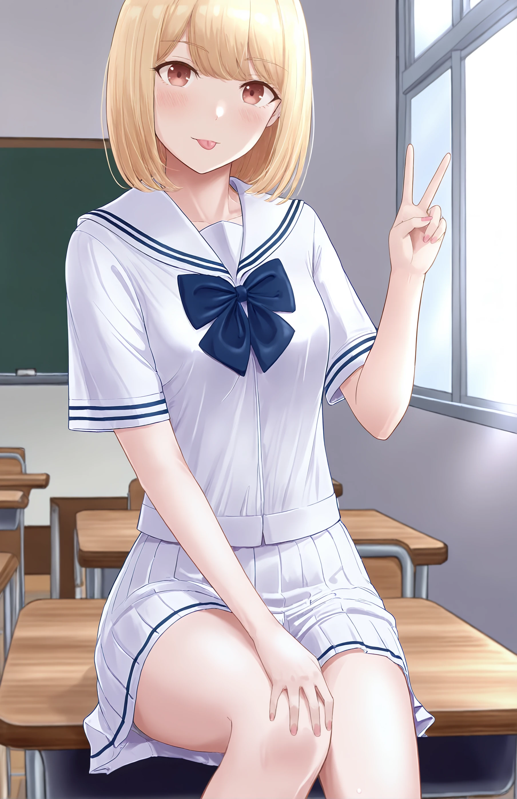 NicoleNinagawa, , short hair, bangs, skirt, blonde hair, shirt, bow, school uniform, white shirt, short sleeves, pleated skirt, serafuku, bowtie, white skirt, blue bow