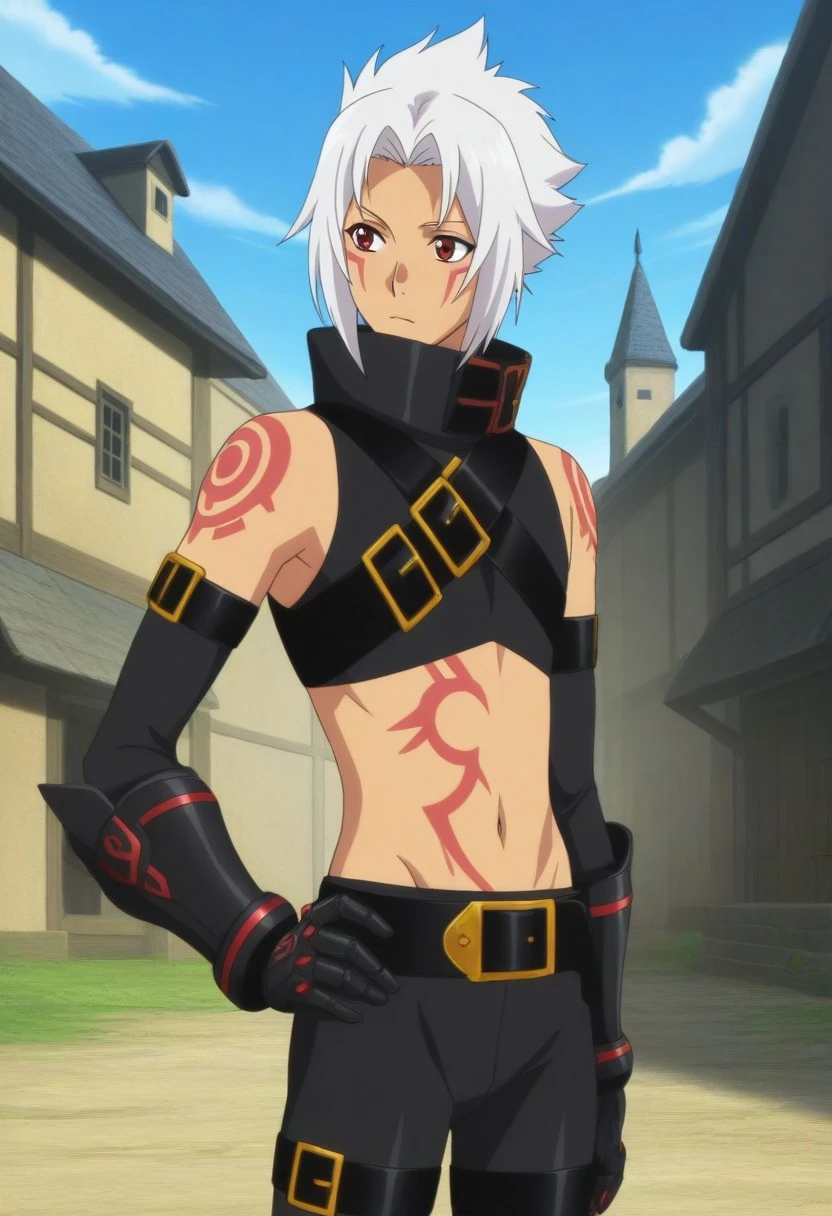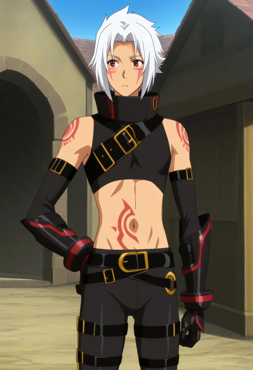 Haseo, white hair, split bangs, red eyes, red face marks, sleeveless crop top, high collar, red shoulders tattoos, red abdomen tattoo, elbow gloves, black vambraces, mechanical hands, red accents, black belt straps, gold accents, leggings, thigh straps, black and red boots