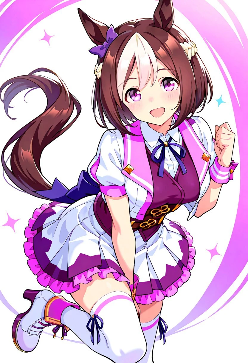 tracen school uniform, sailor collar, sailor shirt, purple shirt, puffy short sleeves, puffy sleeves, purple bowtie, purple bow, back bow, white skirt, pleated skirt, miniskirt, frilled skirt, frills, white thighhighs, zettai ryouiki, brown footwear, shoes, horseshoe ornament, summer uniform, serafuku