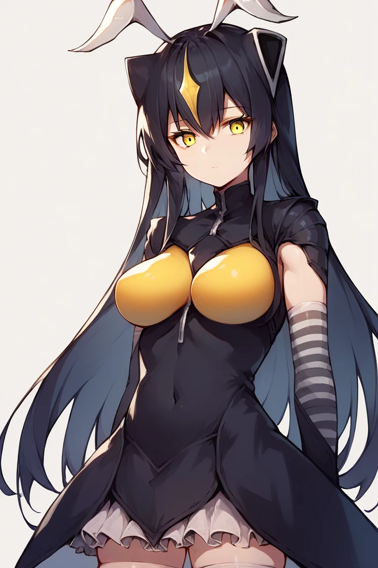 long hair, black hair, antenna, yellow eyes, striped, gloves, elbow gloves, thighhighs, personification, black gloves, yellow breast, black dress