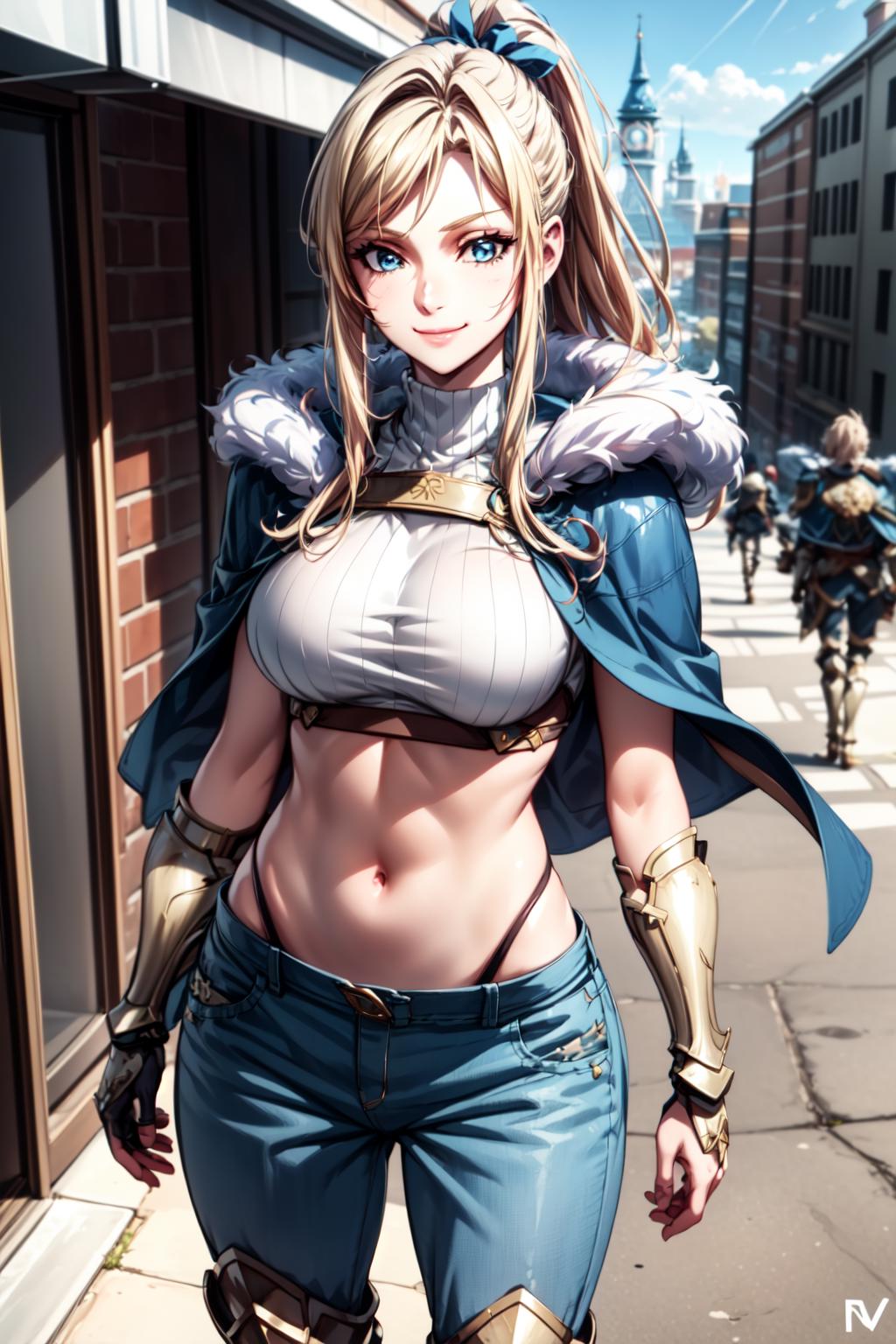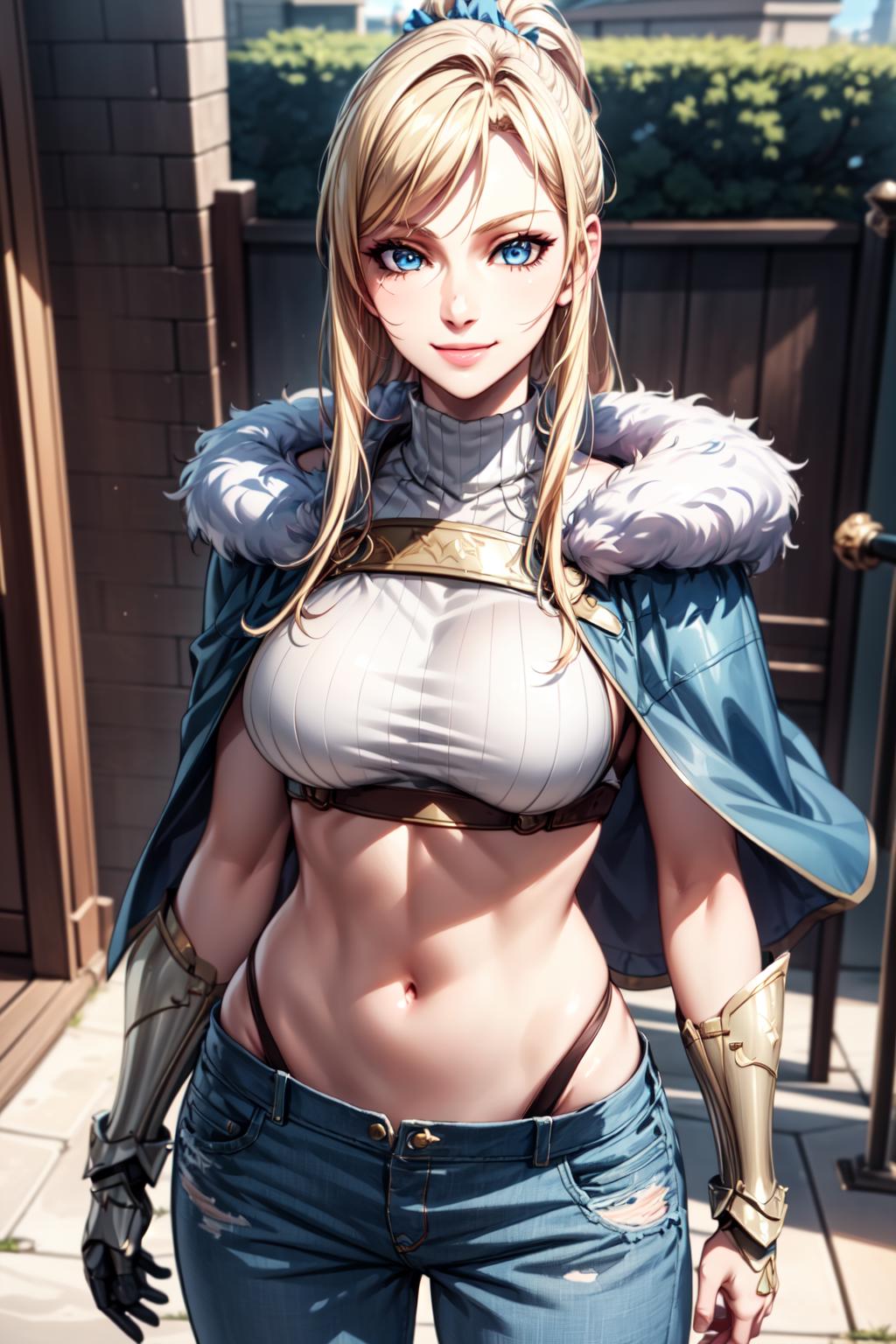 ChloeMorgan_NDV, 1girl, blonde hair, large breasts, long hair, blue eyes, pony tailarmored boots, capelete, fur collar, crop top, pants, beltBest weight: 0.6-0.8