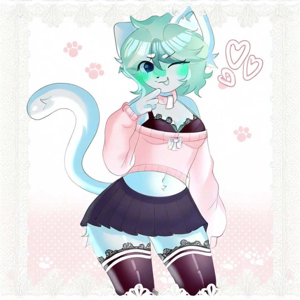 animal ears, cat ears, animal tail, cat tail, mint-green hair, large blue eyes, light blue fur,
