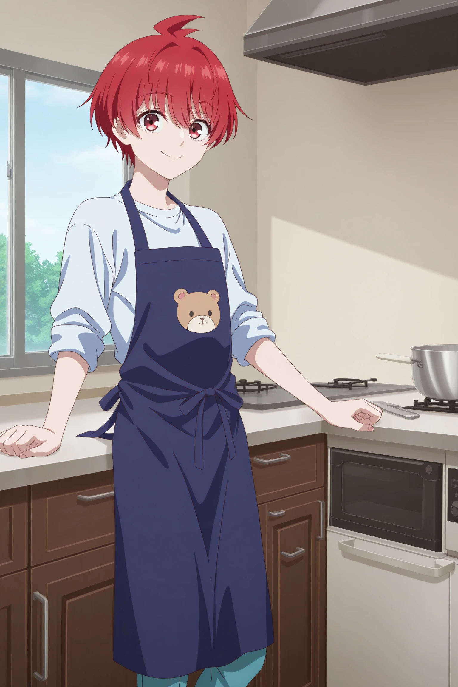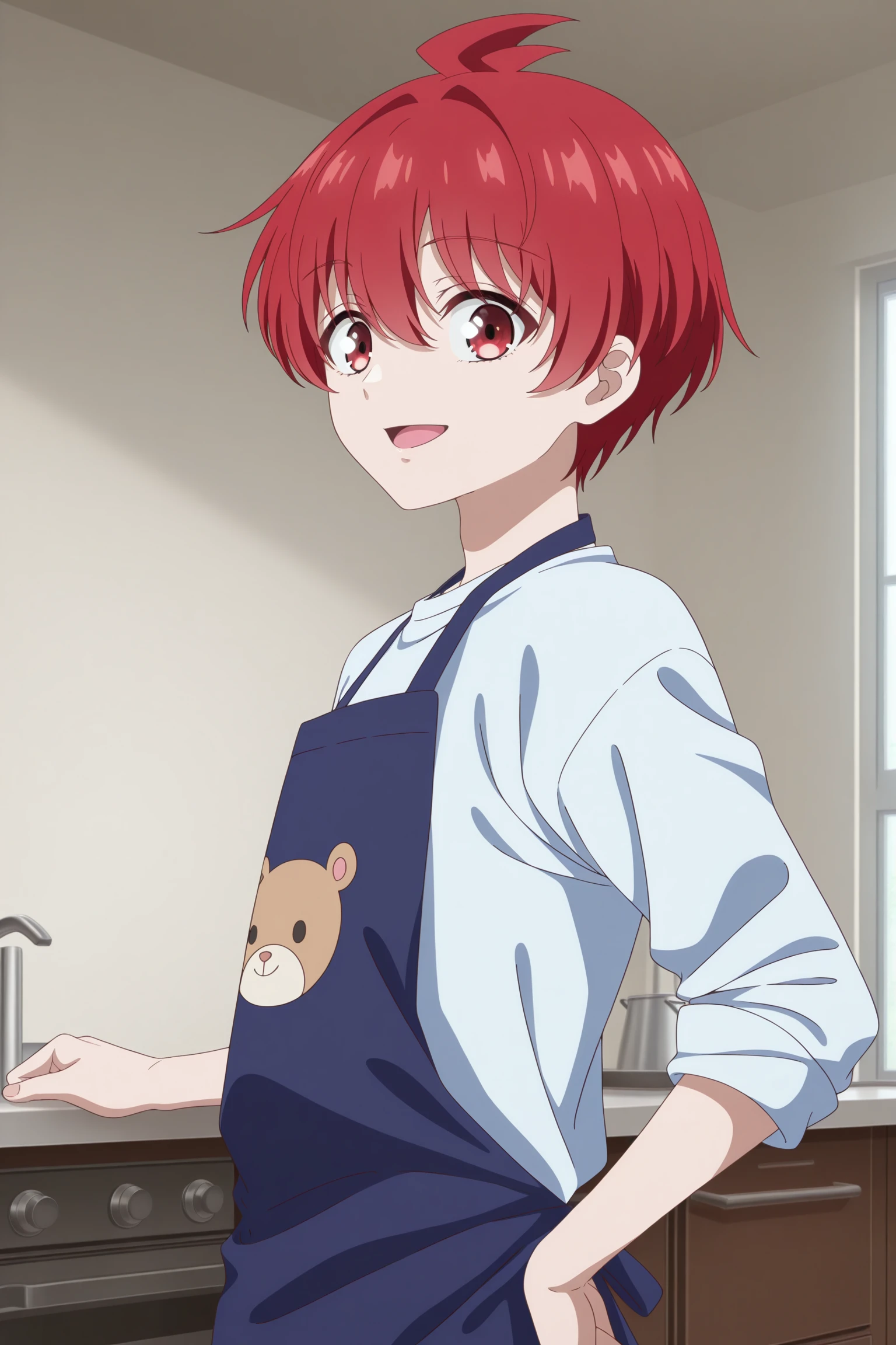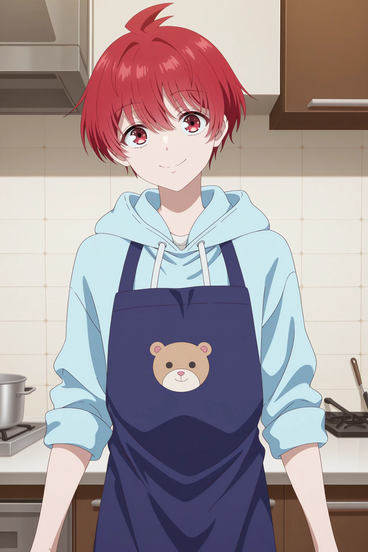 ayseyu, short hairt, red hair, cowlick, choppy bangs, red eyes, sleeves rolled up, blue hoodie, drawstring, blue apron, brown pants, grey socks, slippersKatate Uniform