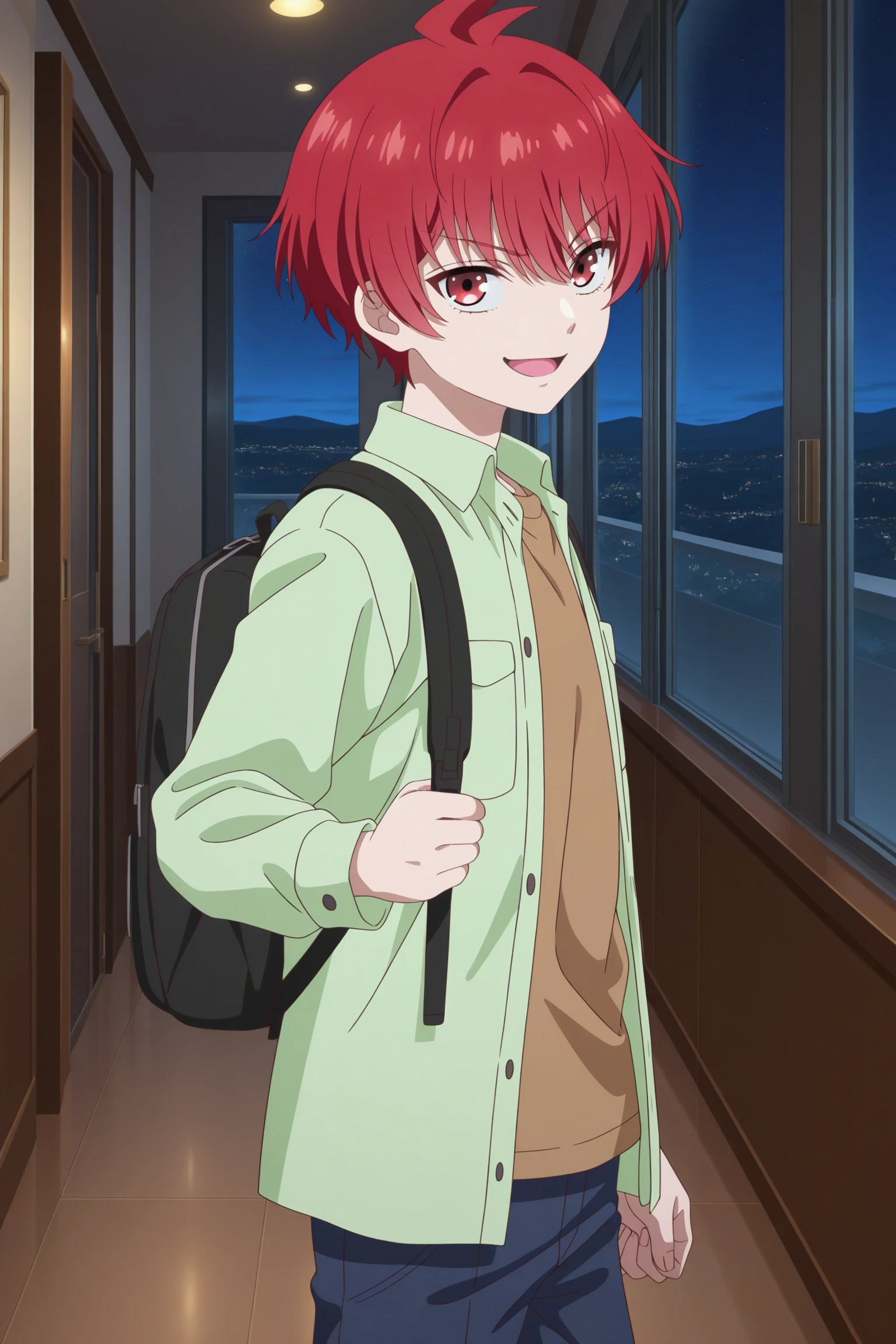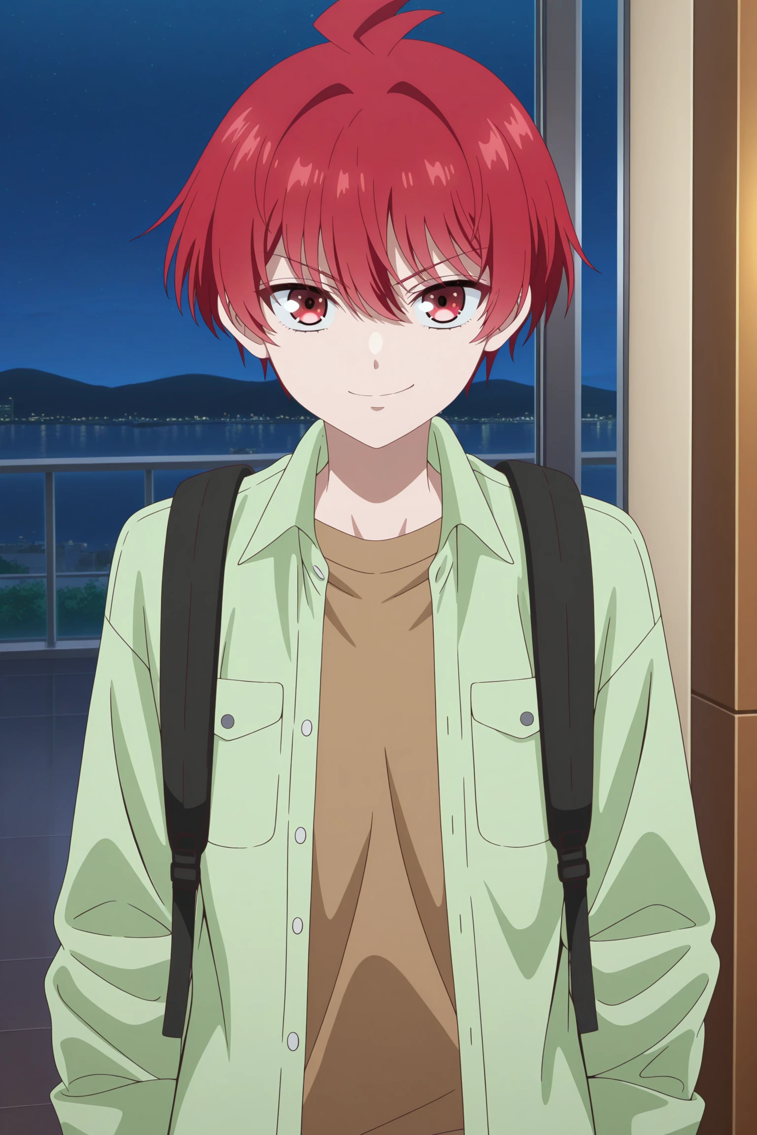 ayseyu, short hairt, red hair, cowlick, choppy bangs, red eyes, long sleeves, green shirt, collared shirt, , brown shirt, shirt under shirt, backpack, blue pants, pants rolled up, green shoes, sneakers
