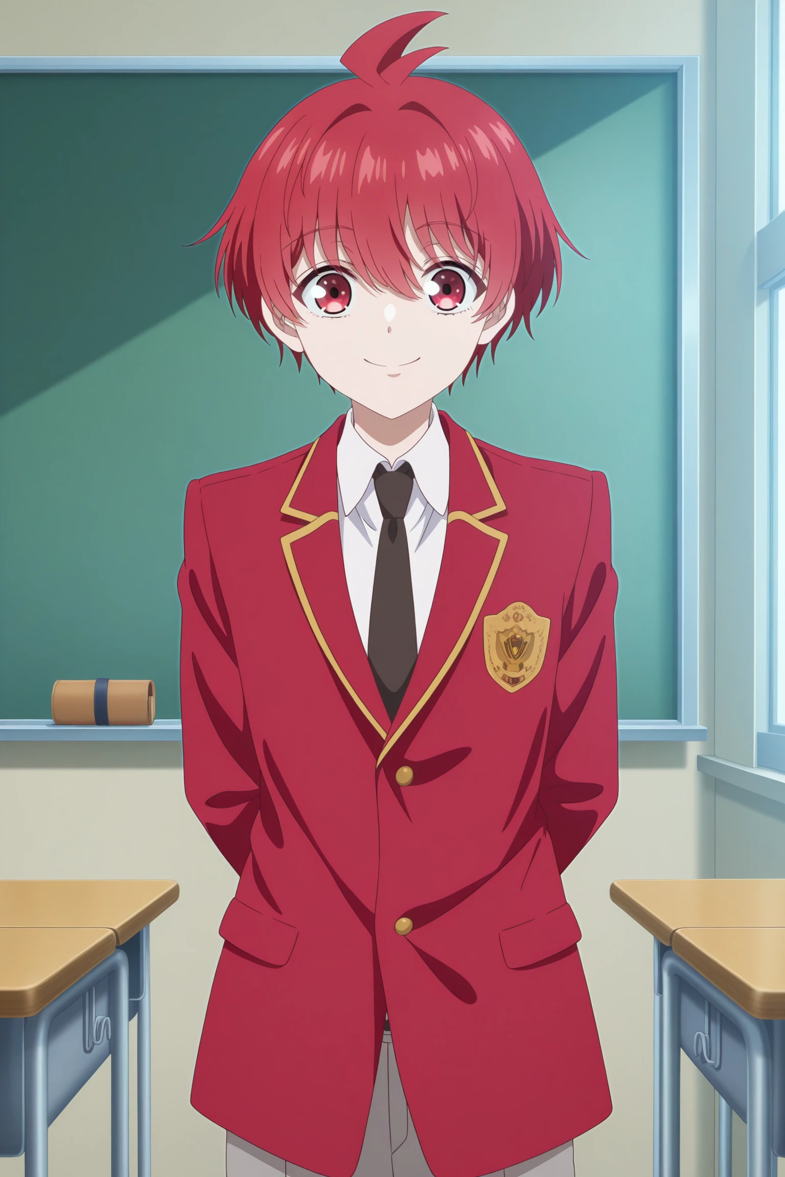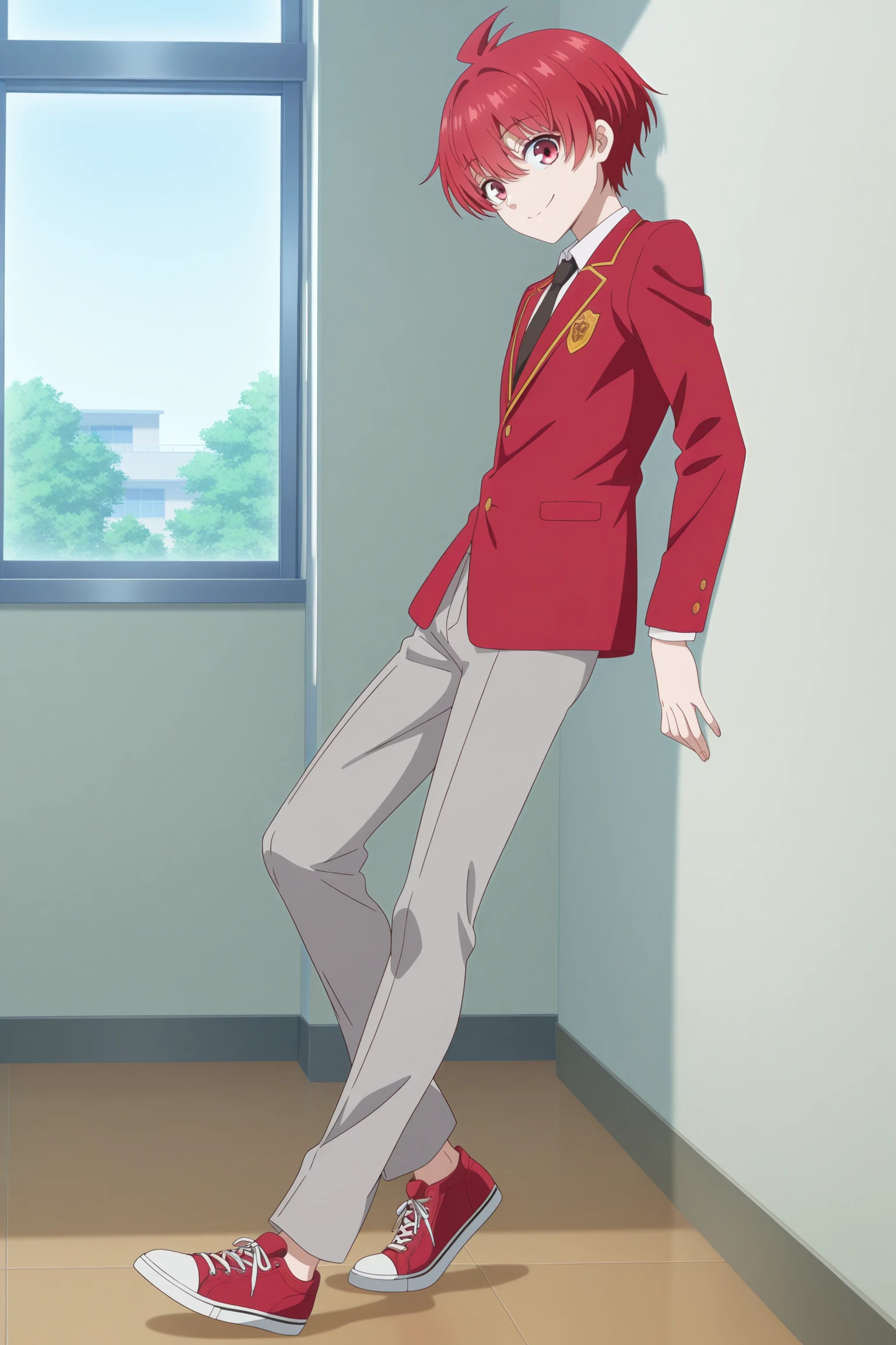 ayseyu, short hairt, red hair, cowlick, choppy bangs, red eyes, long sleeves, red jacket, white shirt, collared shirt, black necktie, grey pants, red shoes, sneakers