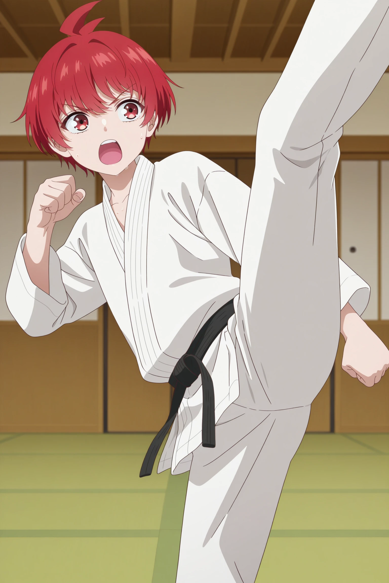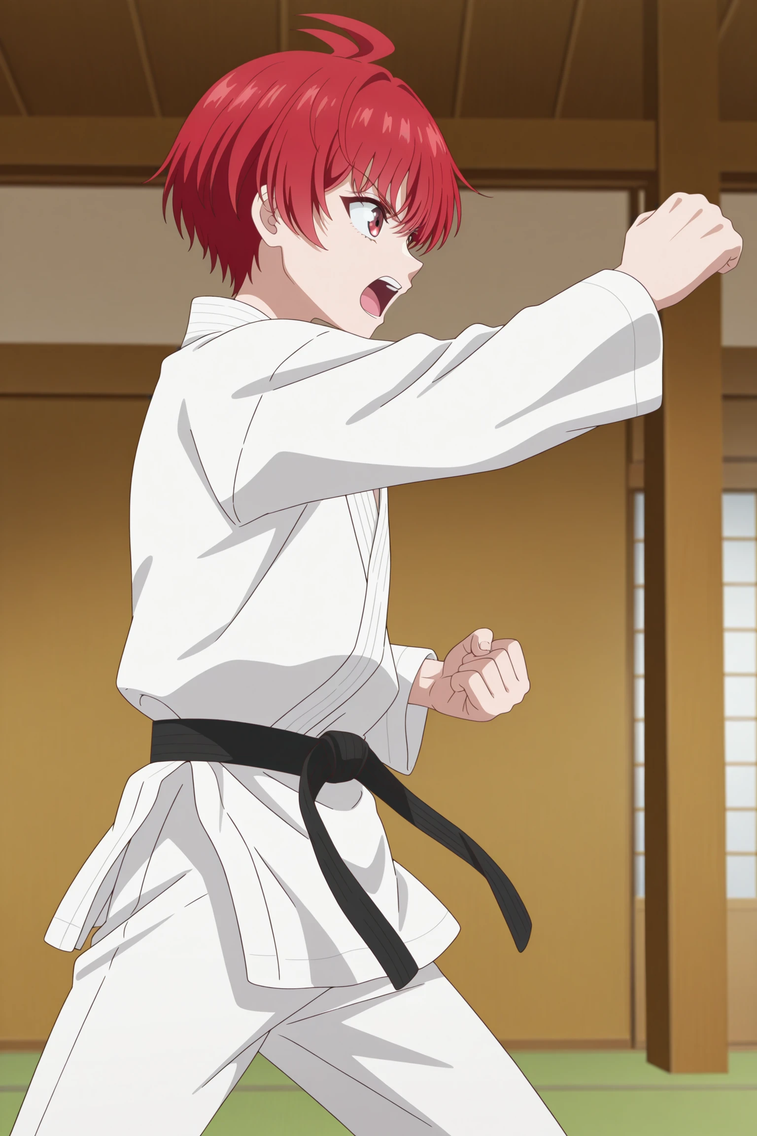 ayseyu, short hairt, red hair, cowlick, choppy bangs, red eyes, long sleeves, karate gi, uwagi, martial arts belt, red gloves, white pants, red shoes