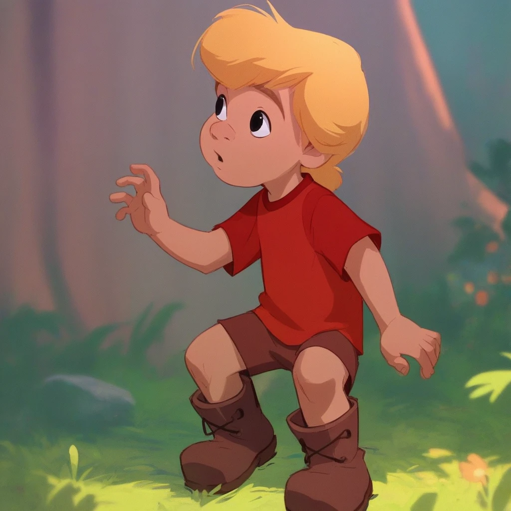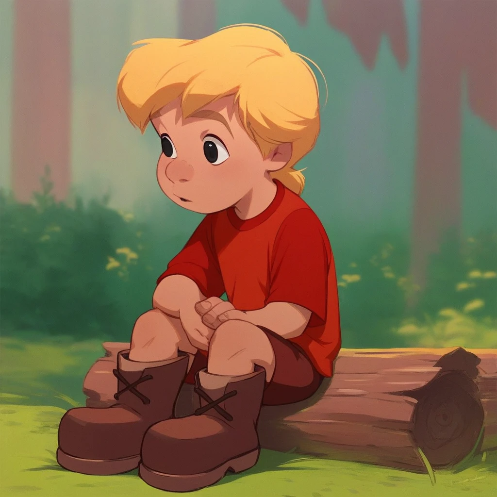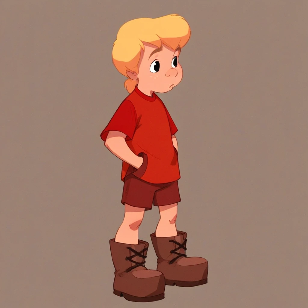 cody, blonde hair, black eyes, red shirt, shorts, boots