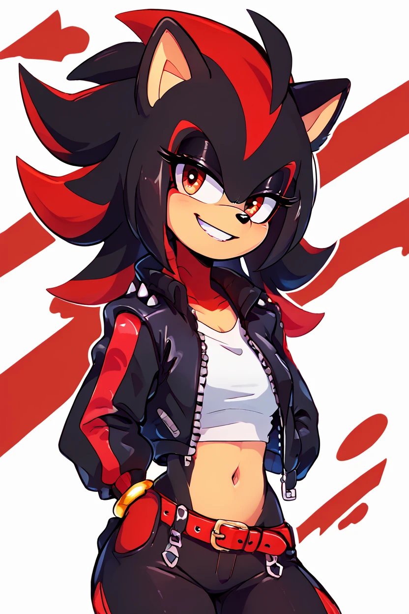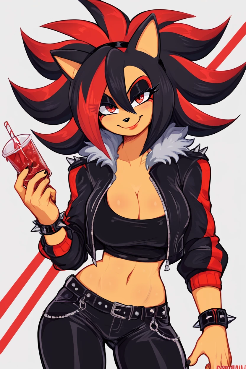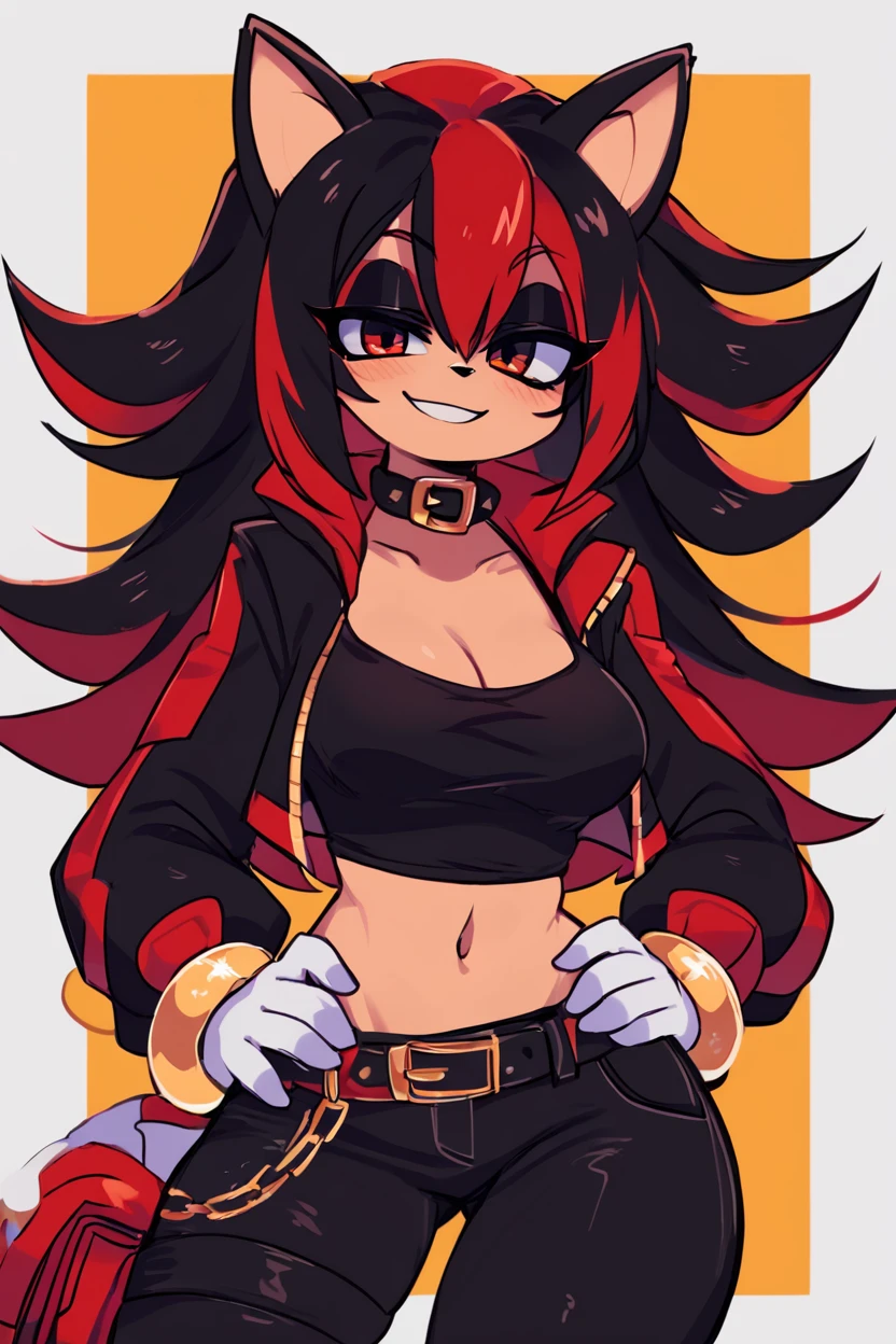 zzShady, red eyes, multicolored hair, two-tone hair, streaked hair, black hair, red hair, animal ears, long hair, furry, spiked hair, black crop top, open jacket, black leather jacket, gold bracelet, black leather pants, white gloves,