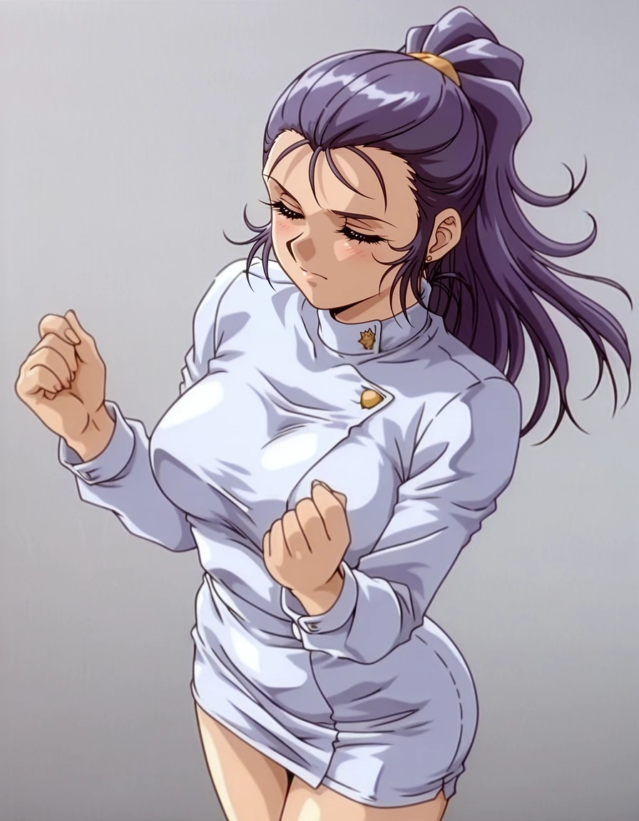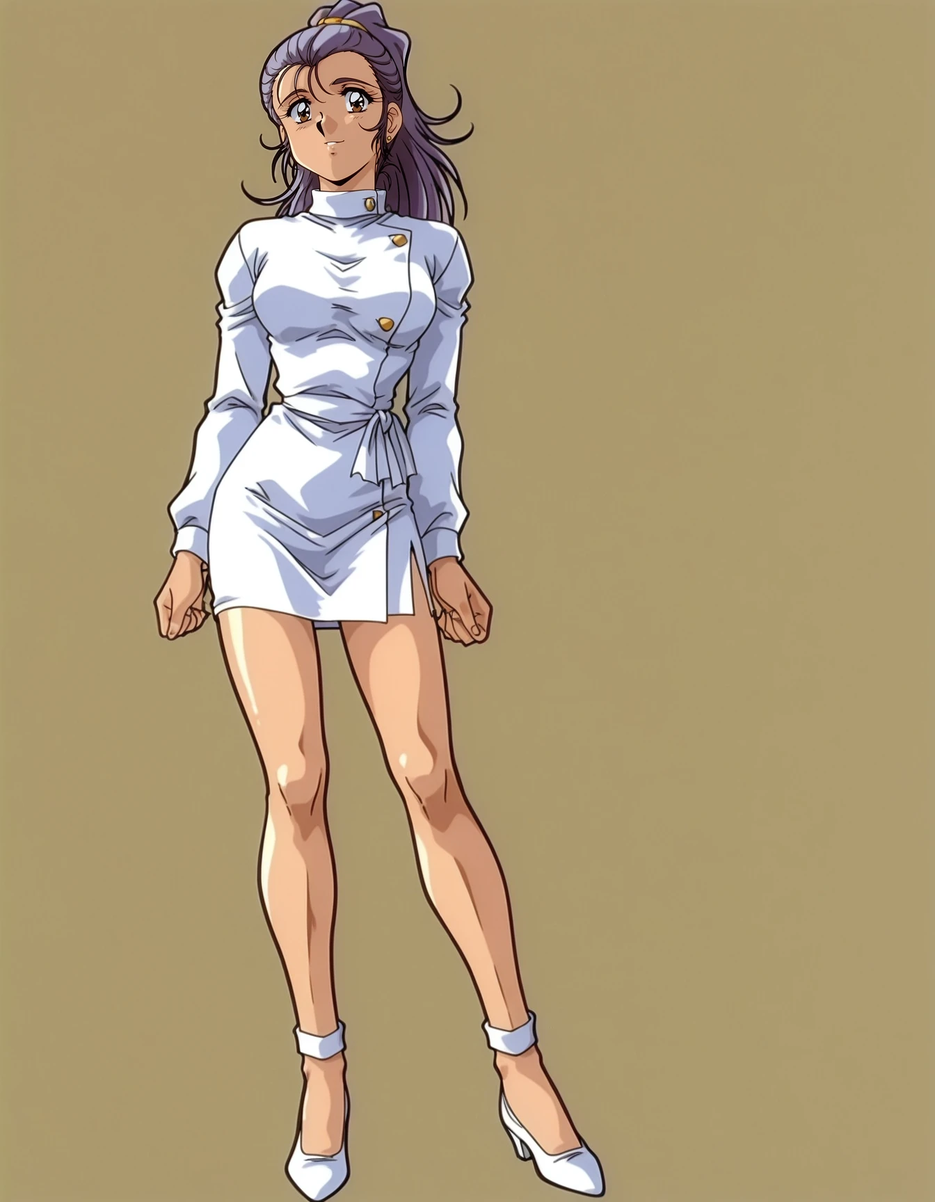 mai_assistantsd,retro_artstyle,1990s_\(style\),ponytail,long_hair,purple_hair,brown_eyes,stud_earrings,white_dress,long_sleeves,collared_dress,short_dress