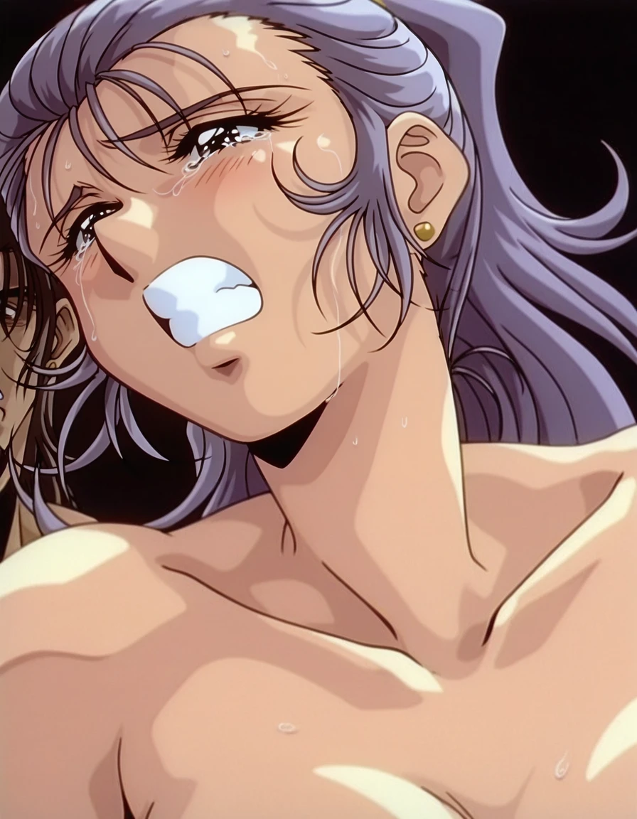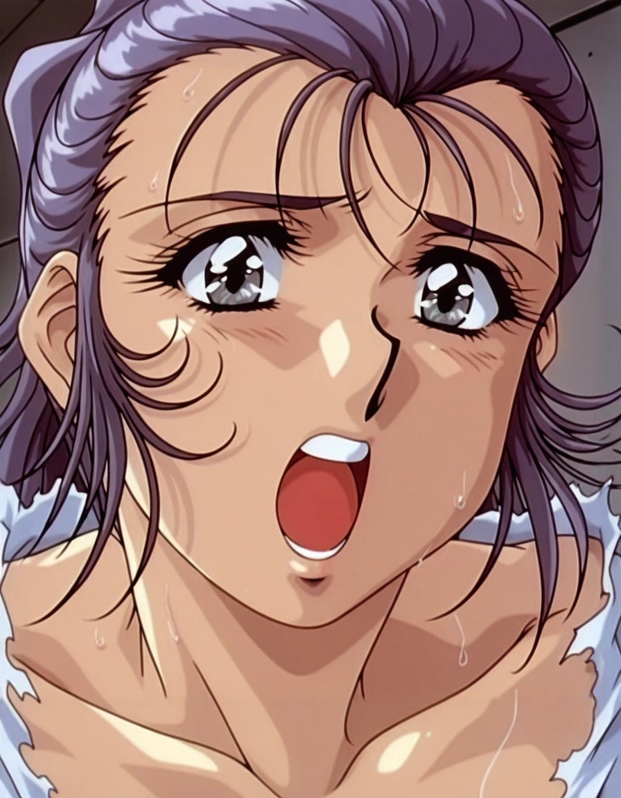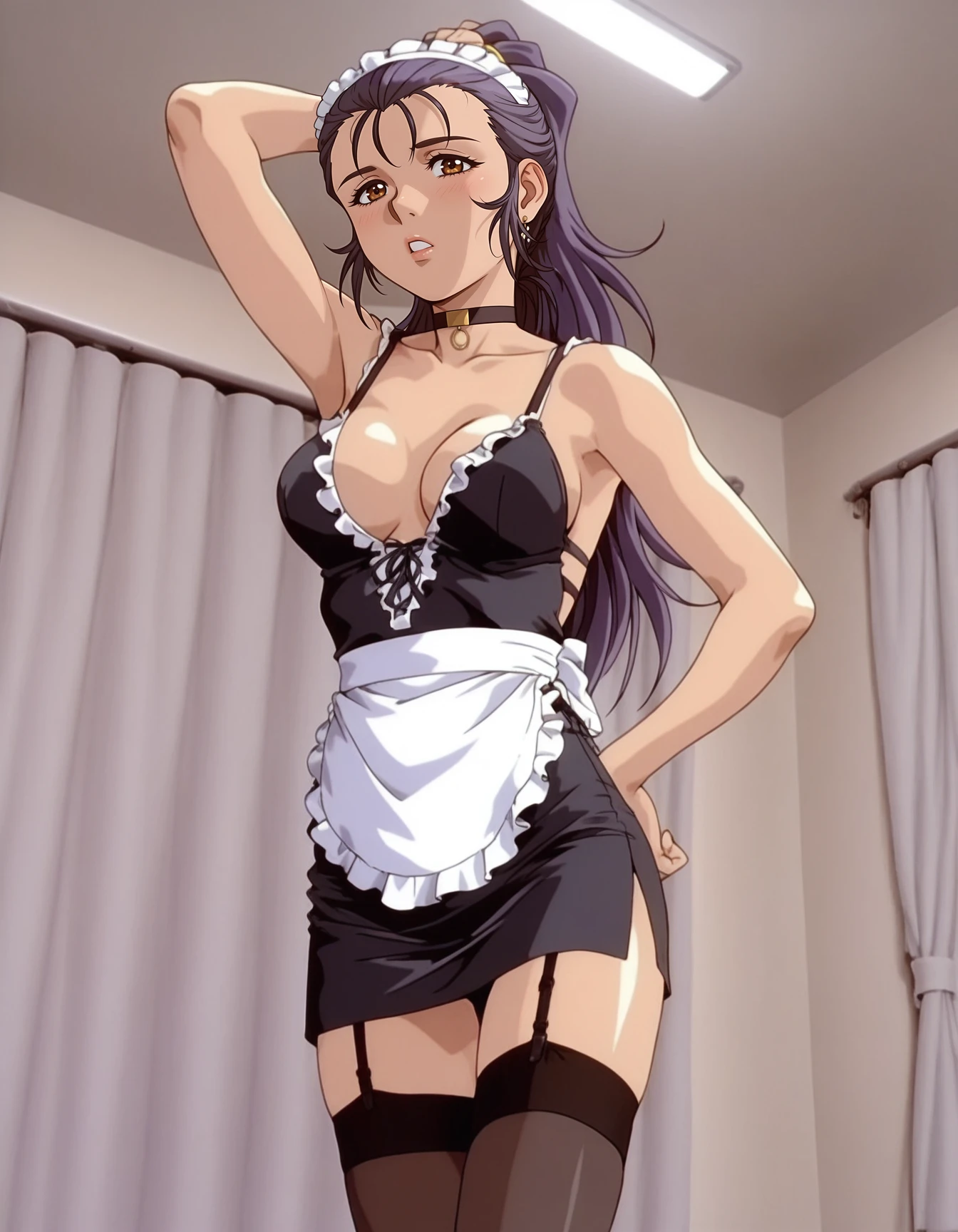 mai_assistantsd,retro_artstyle,1990s_\(style\),ponytail,long_hair,purple_hair,brown_eyes,stud_earrings,white_dress,long_sleeves,collared_dress,short_dressRecommend preferred Strength: 0.7~1.