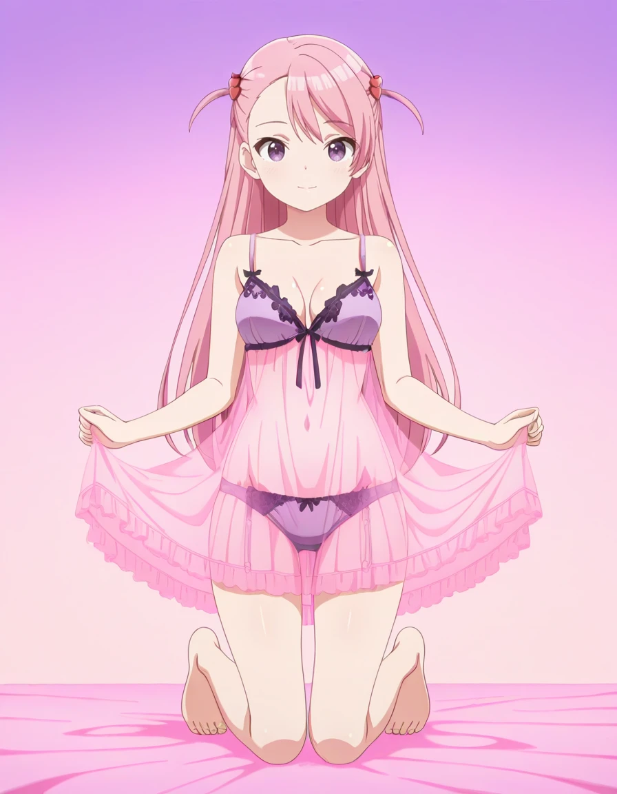 nightgown, see-through, pink negligee, purple lingerie, pantiesDescription