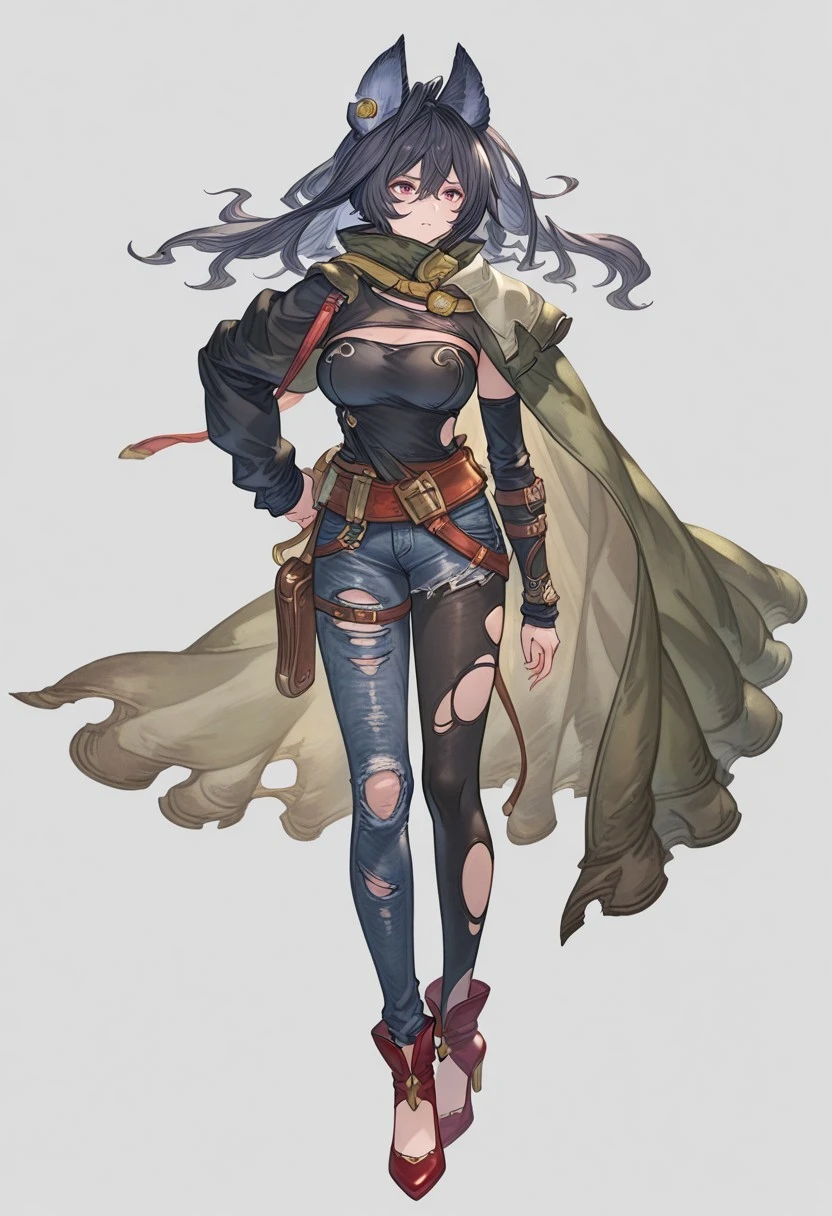 Add ''lgtgbil, cloth cape, strapless top, torn single leg legging, torn long single leg jeans, forearm sleeve, holster, belt, heels, messy air,'' for her light version appearance.
